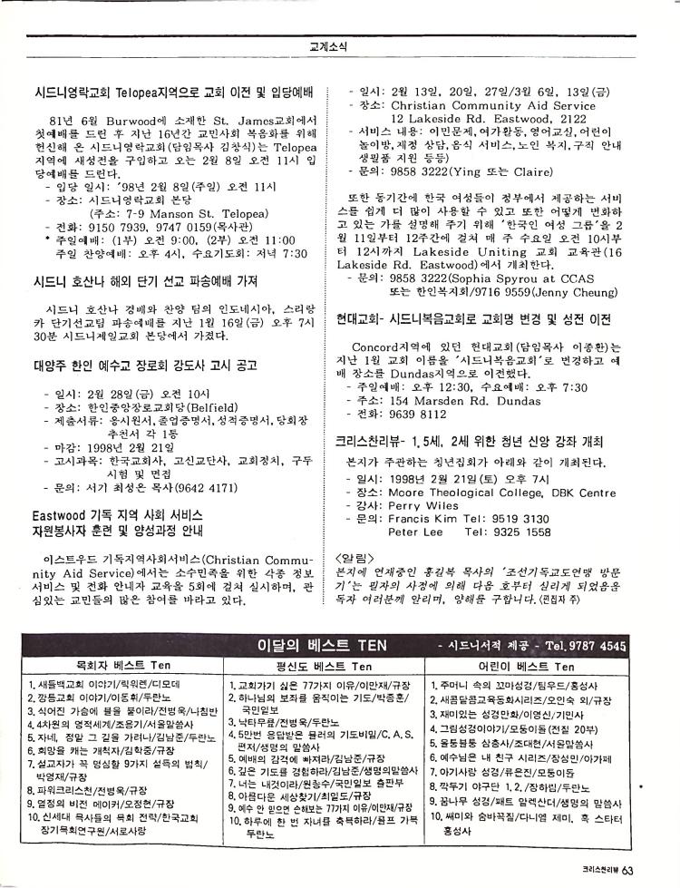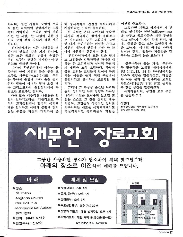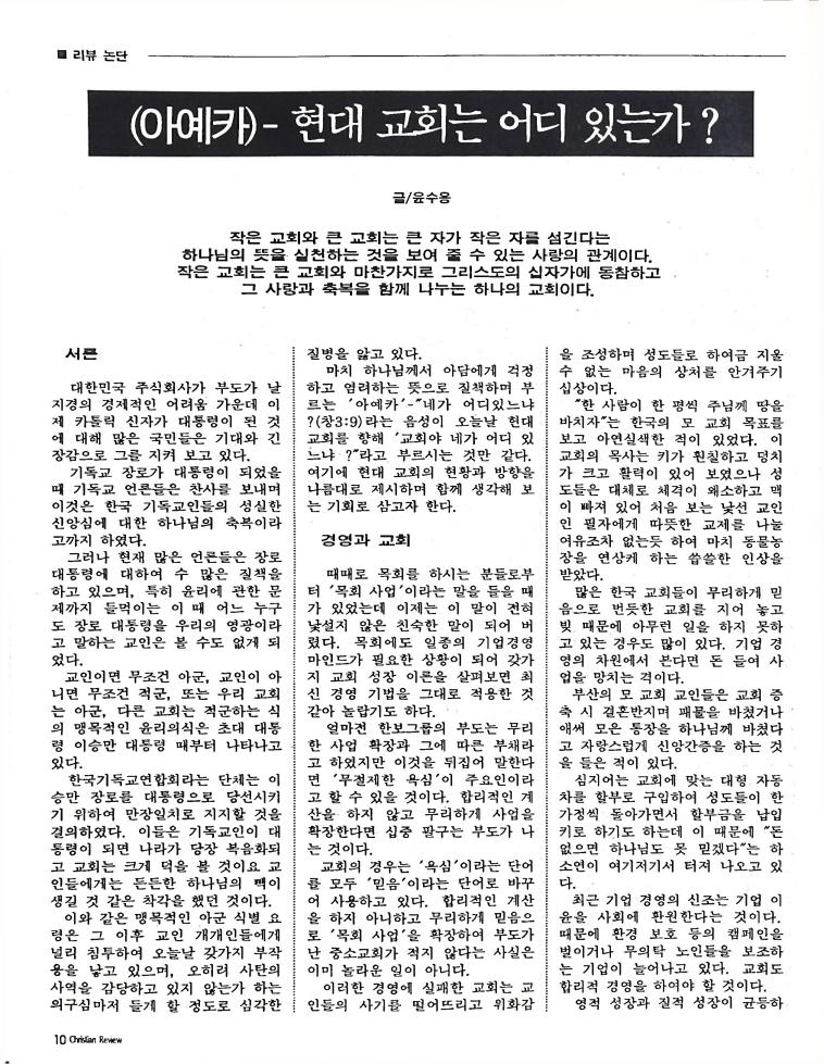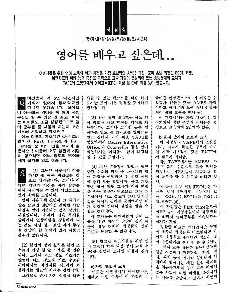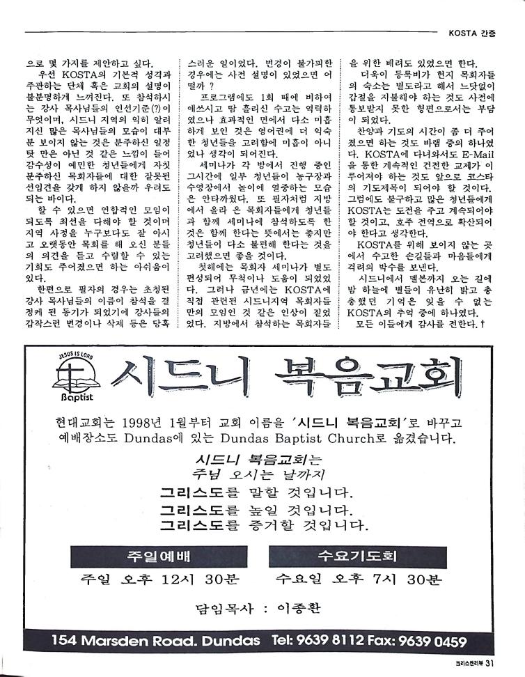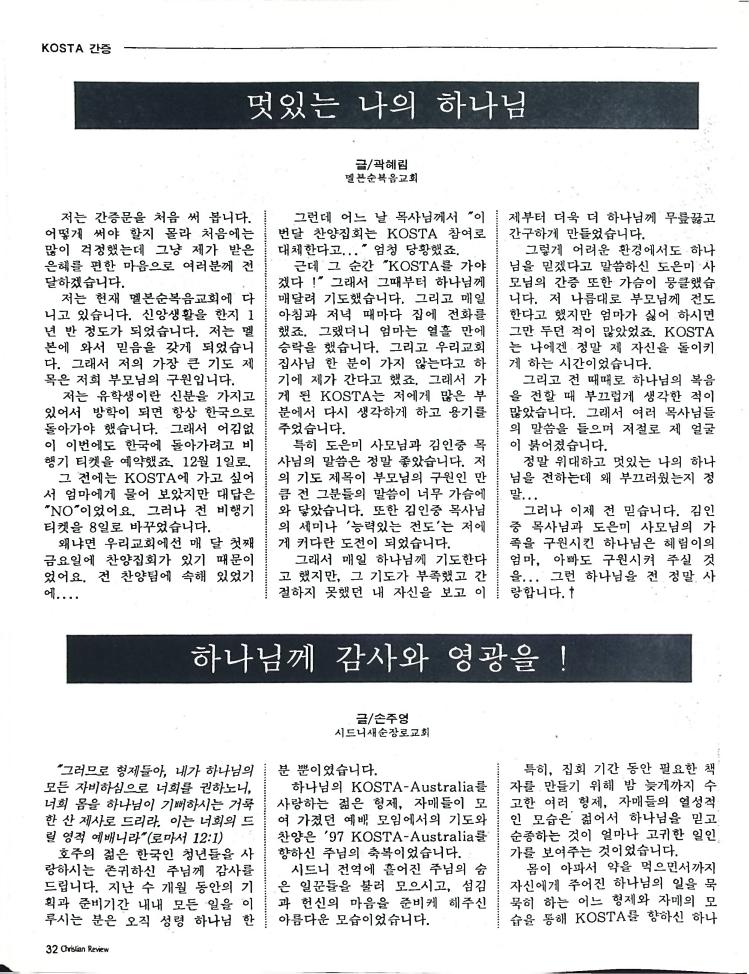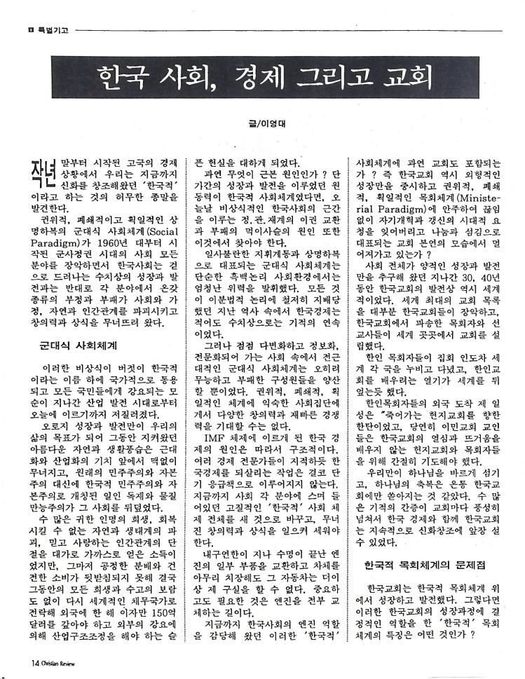 호주에서 1990년 1월부터 제작된 크리스찬 리뷰는 굳건한 신앙의 터전위에 교파를 초월한 신앙공동체로서 복음을 널리 전하기 위한 선교의 목적을 갖고 창간되었다. 특별기고-한국사회, 경제 그리고 교회 / 특별기고-IMF 시대와 한국교회 그리고 선교 / 리뷰논단-현대교회는 어디 있는가? / 카메라뉴스-다문화성가합창제