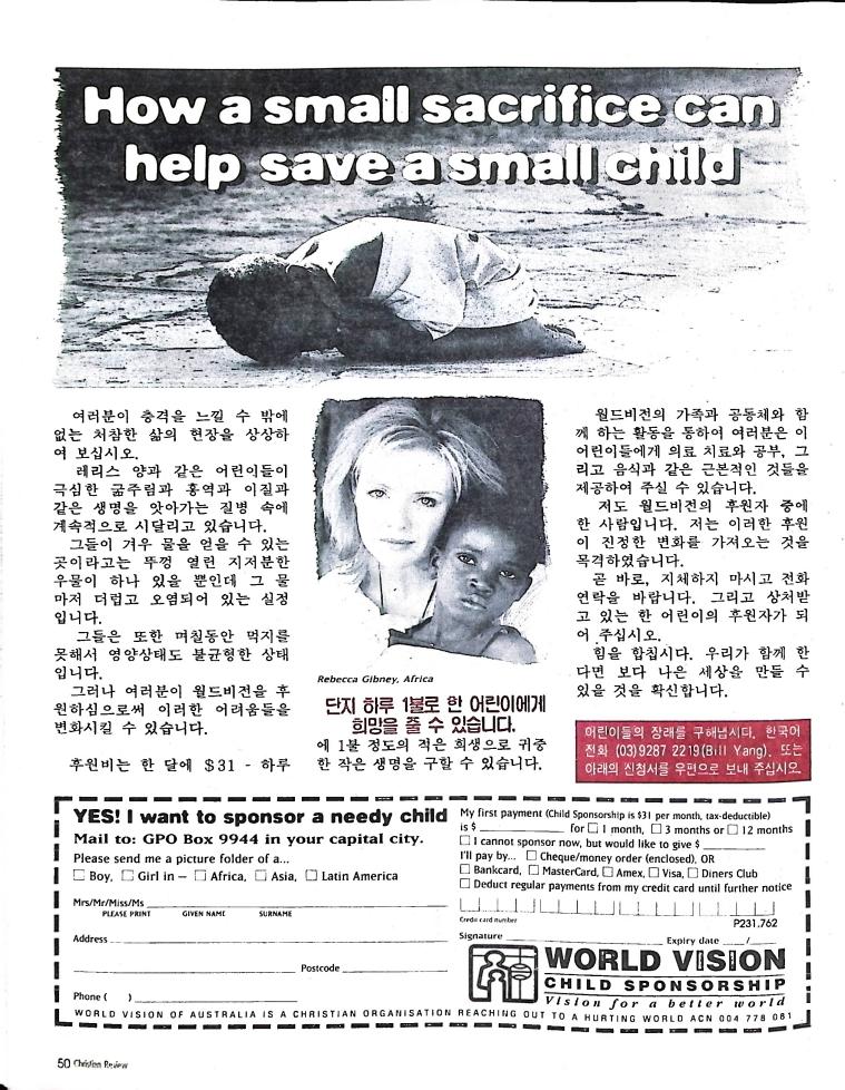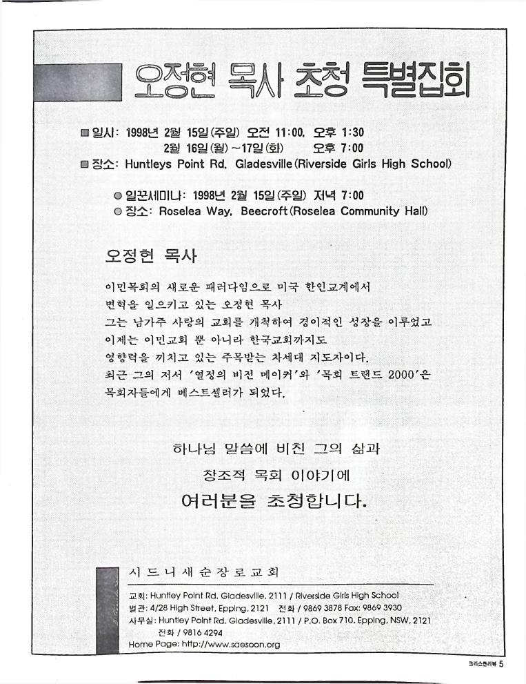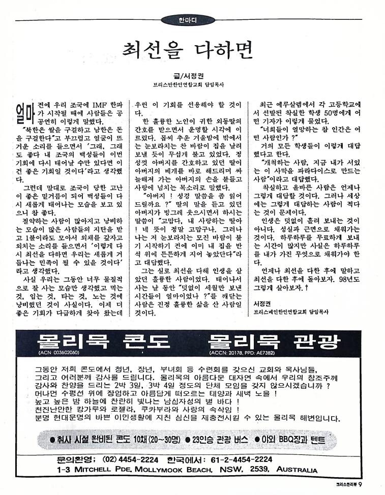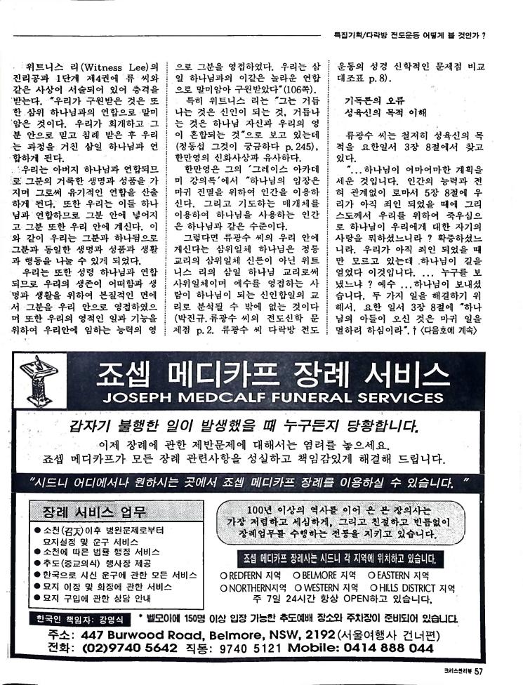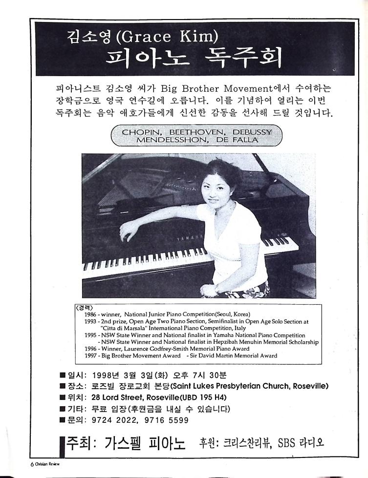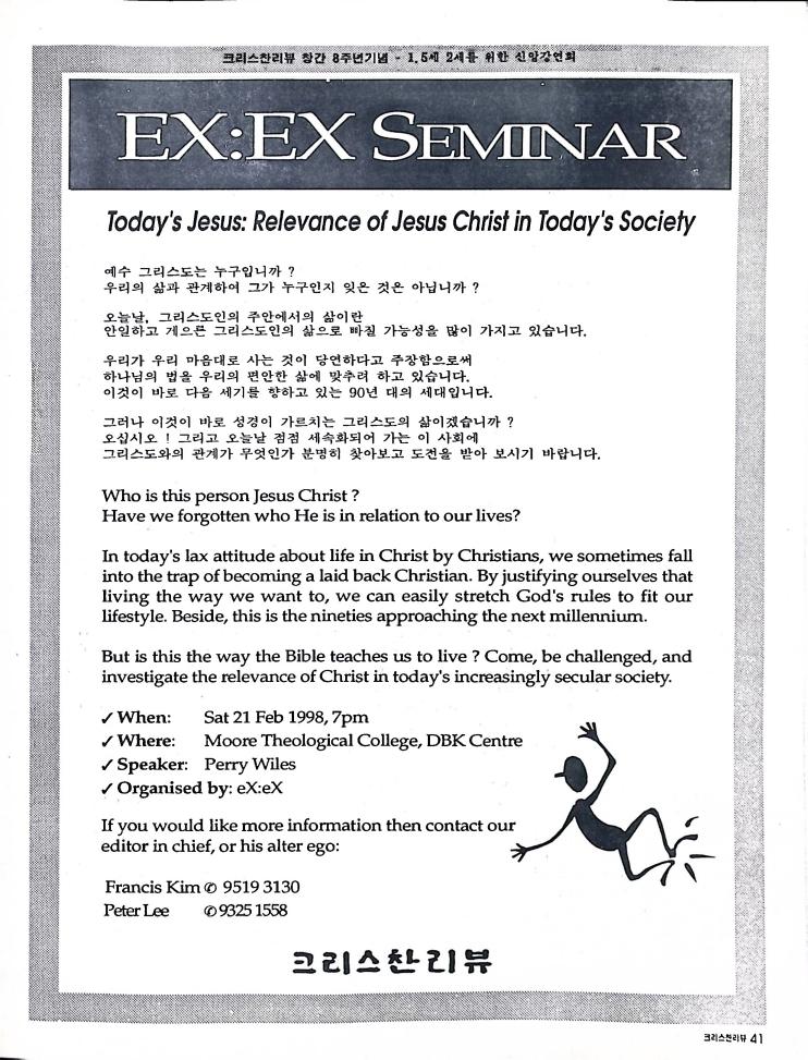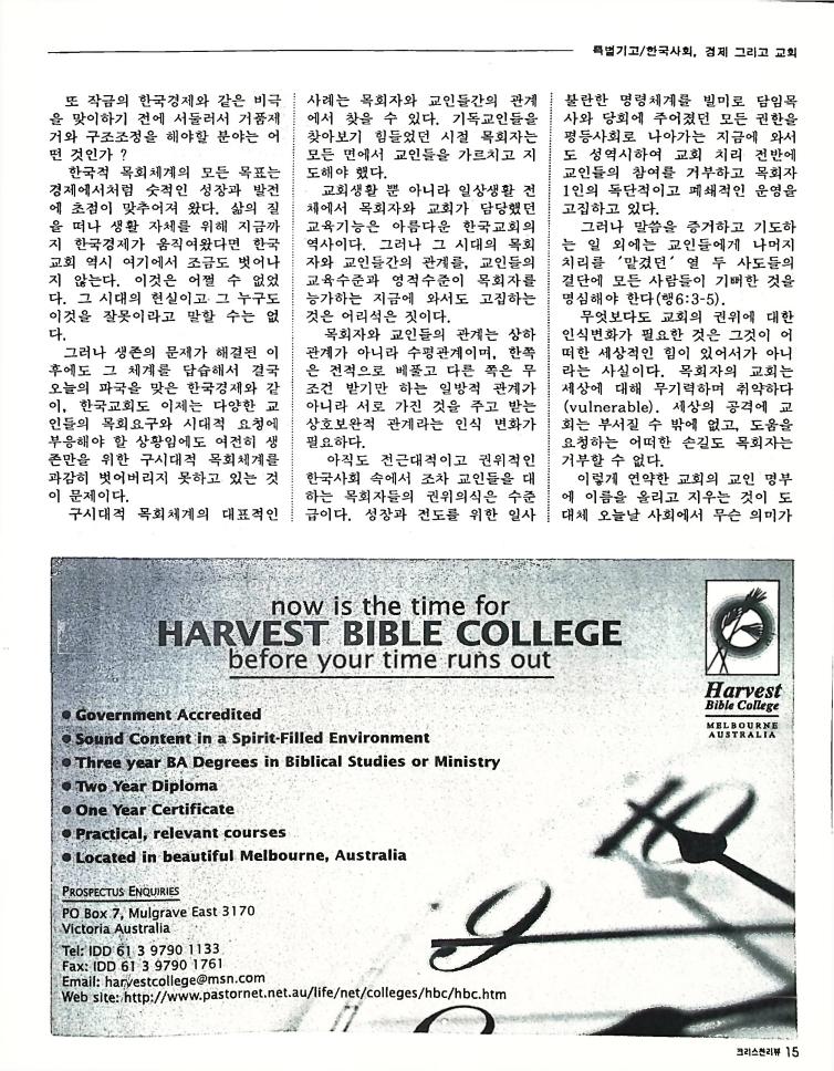 호주에서 1990년 1월부터 제작된 크리스찬 리뷰는 굳건한 신앙의 터전위에 교파를 초월한 신앙공동체로서 복음을 널리 전하기 위한 선교의 목적을 갖고 창간되었다. 특별기고-한국사회, 경제 그리고 교회 / 특별기고-IMF 시대와 한국교회 그리고 선교 / 리뷰논단-현대교회는 어디 있는가? / 카메라뉴스-다문화성가합창제