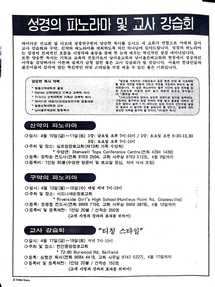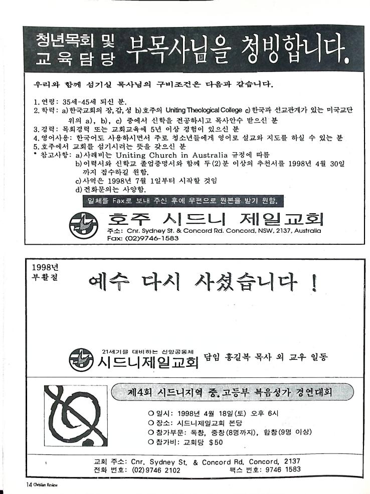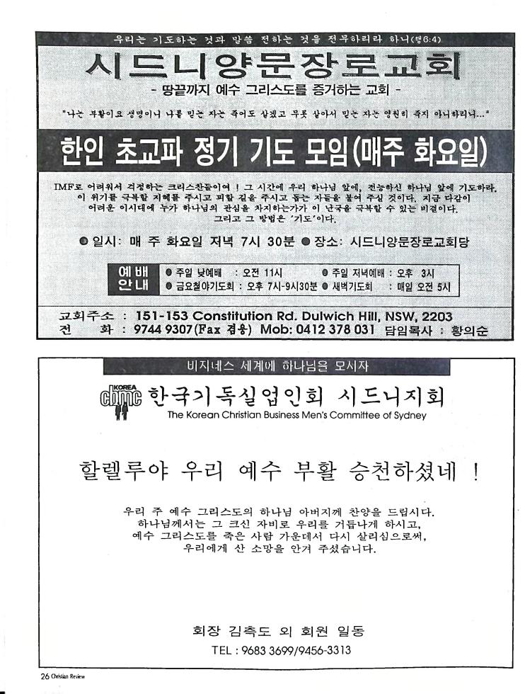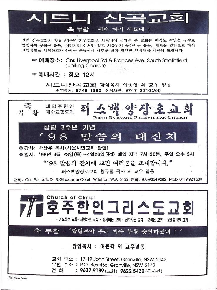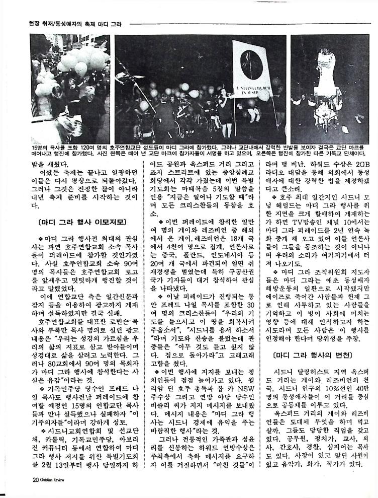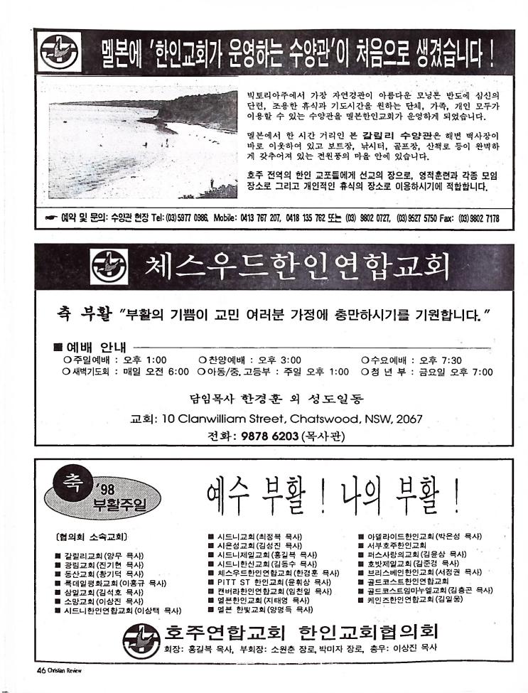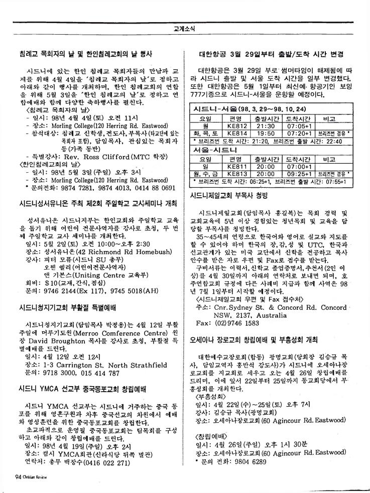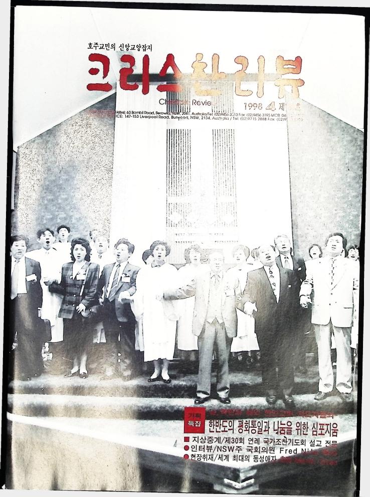 호주에서 1990년 1월부터 제작된 크리스찬 리뷰는 굳건한 신앙의 터전위에 교파를 초월한 신앙공동체로서 복음을 널리 전하기 위한 선교의 목적을 갖고 창간되었다. 4월의 생각-부활절과 부활의 실제 / 현장취재-동성애자들의 축제 마디 그라 / 기획특집-남북한 해외 한인교회 지도자들의 한반도 통일과 나눔을 위한 심포지움 / 지상중계-IMF와 기독교 / 지상중계-제30회 국가조찬기도회