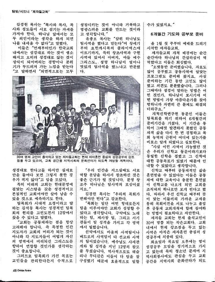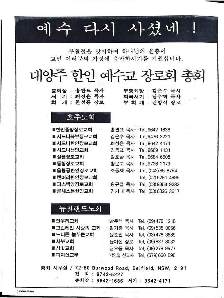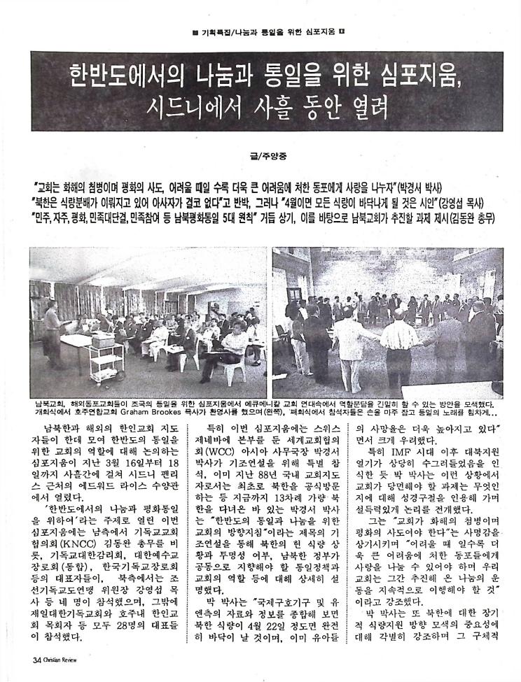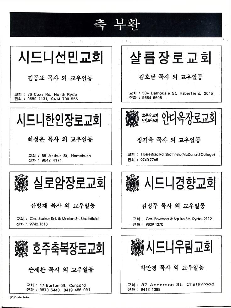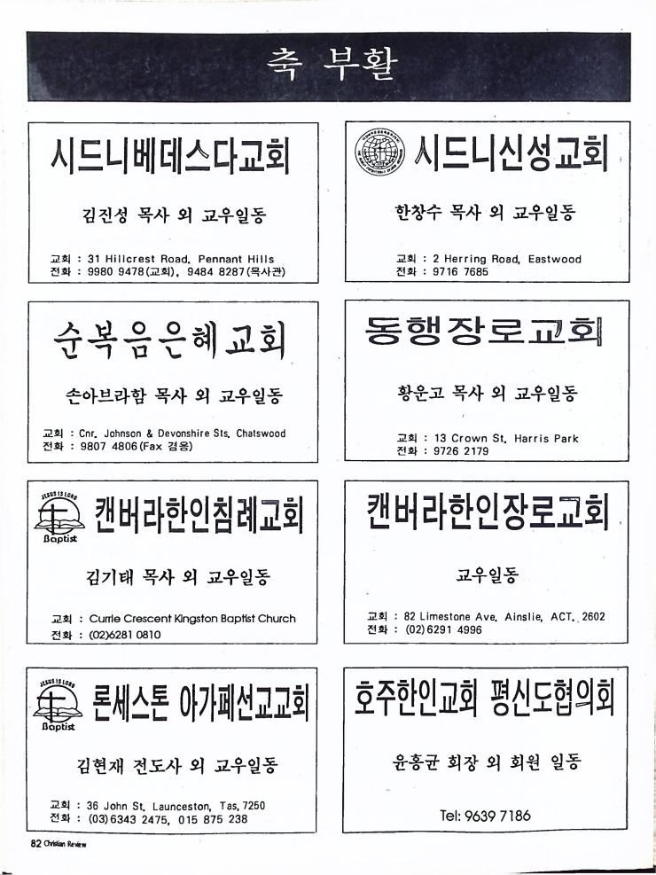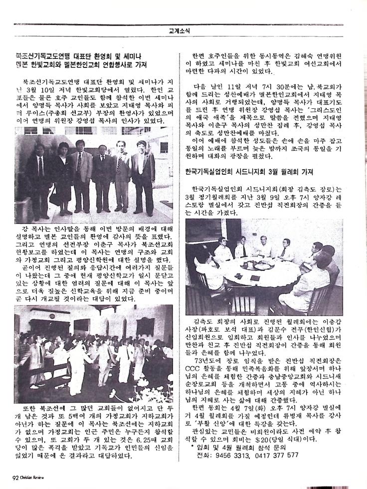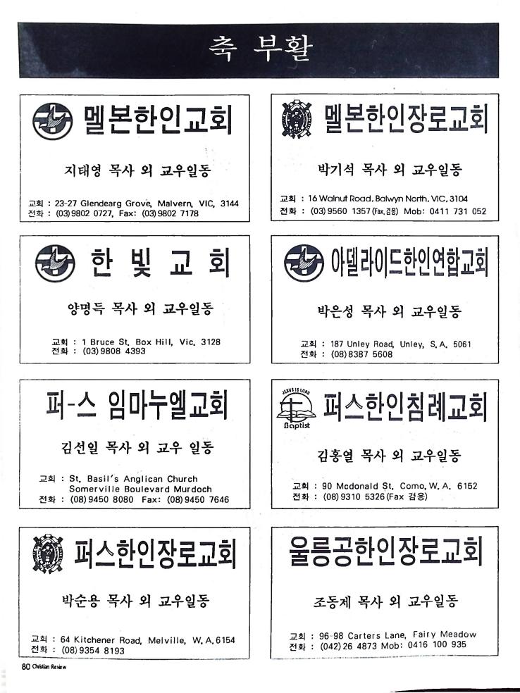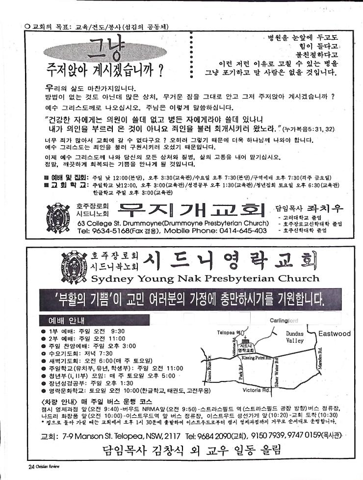 호주에서 1990년 1월부터 제작된 크리스찬 리뷰는 굳건한 신앙의 터전위에 교파를 초월한 신앙공동체로서 복음을 널리 전하기 위한 선교의 목적을 갖고 창간되었다. 4월의 생각-부활절과 부활의 실제 / 현장취재-동성애자들의 축제 마디 그라 / 기획특집-남북한 해외 한인교회 지도자들의 한반도 통일과 나눔을 위한 심포지움 / 지상중계-IMF와 기독교 / 지상중계-제30회 국가조찬기도회