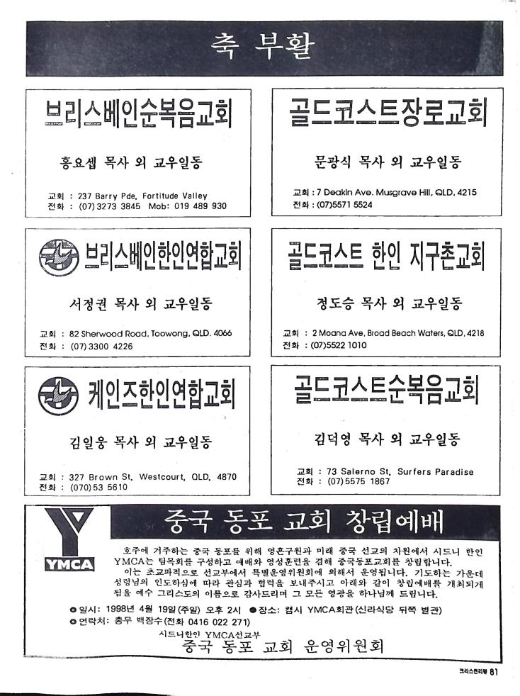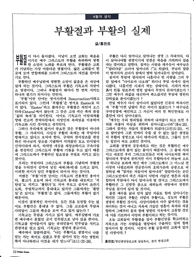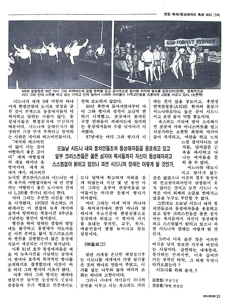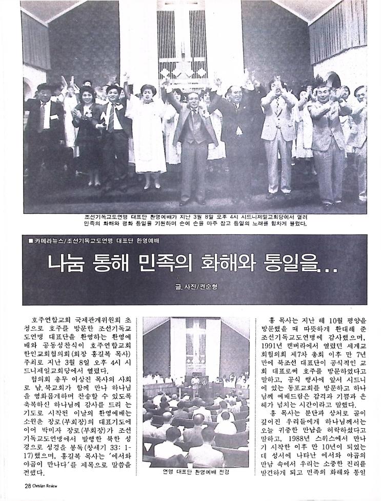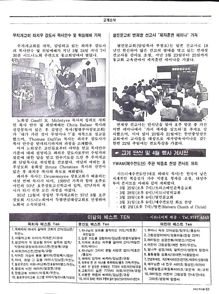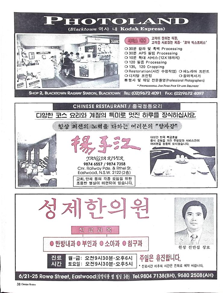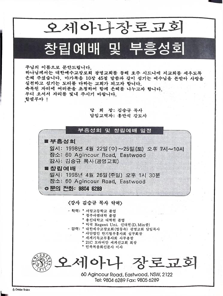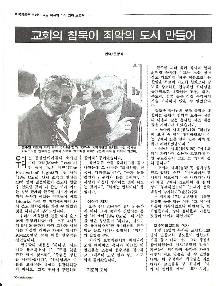호주에서 1990년 1월부터 제작된 크리스찬 리뷰는 굳건한 신앙의 터전위에 교파를 초월한 신앙공동체로서 복음을 널리 전하기 위한 선교의 목적을 갖고 창간되었다. 4월의 생각-부활절과 부활의 실제 / 현장취재-동성애자들의 축제 마디 그라 / 기획특집-남북한 해외 한인교회 지도자들의 한반도 통일과 나눔을 위한 심포지움 / 지상중계-IMF와 기독교 / 지상중계-제30회 국가조찬기도회