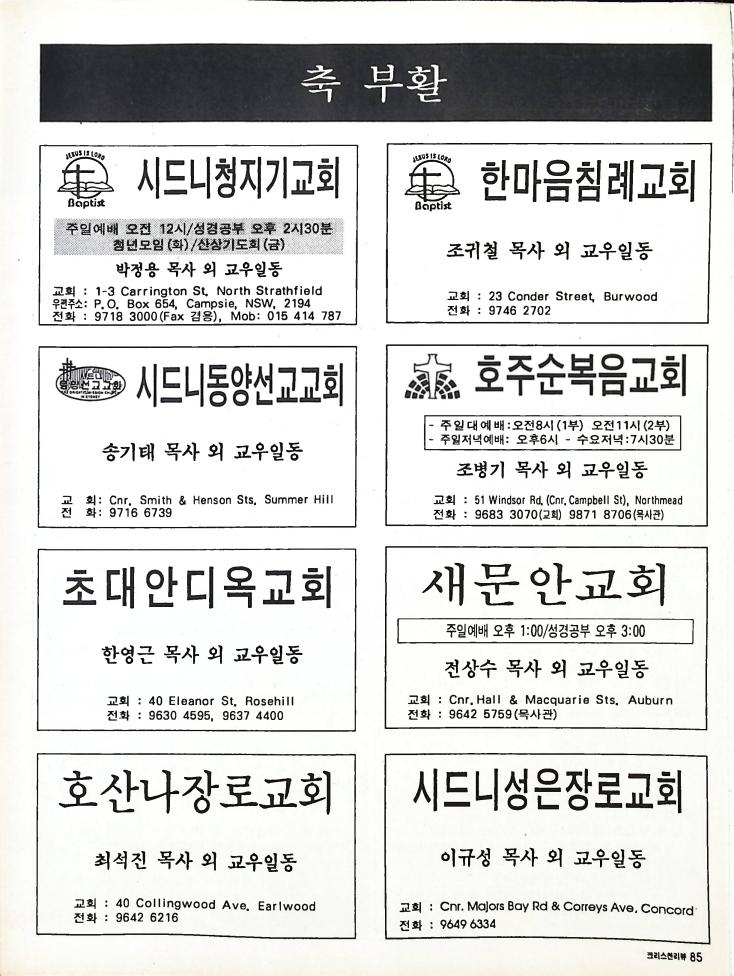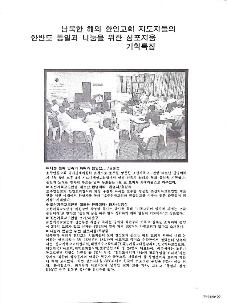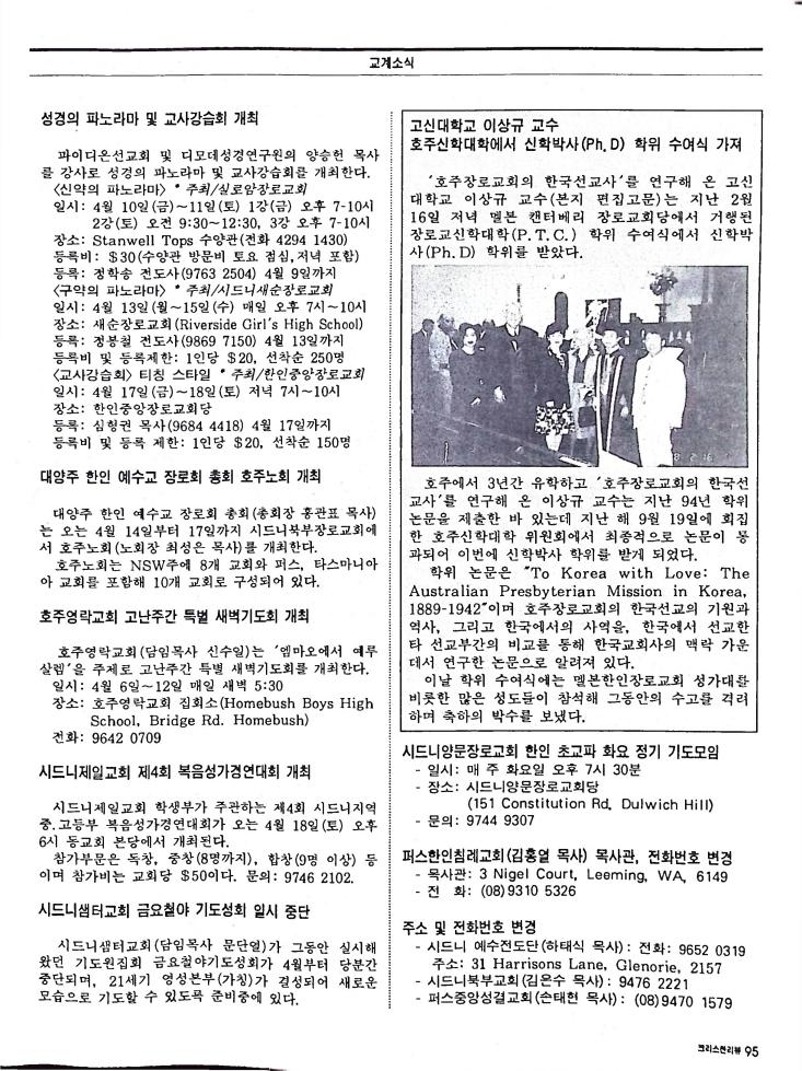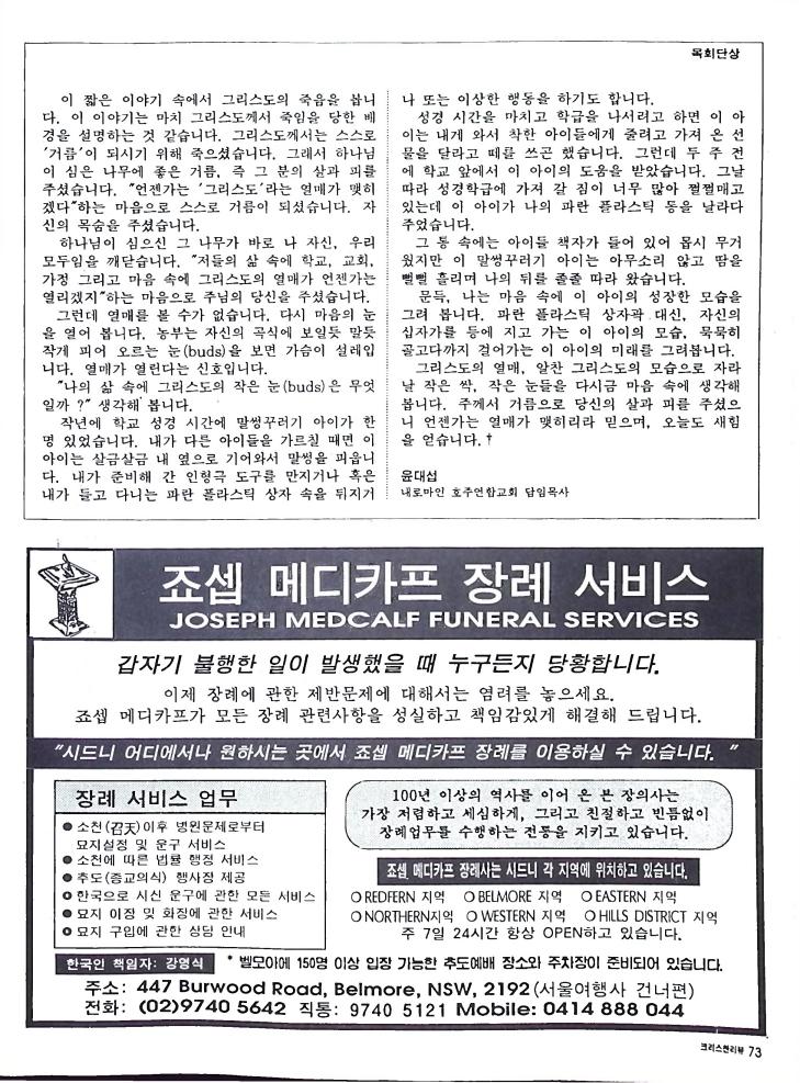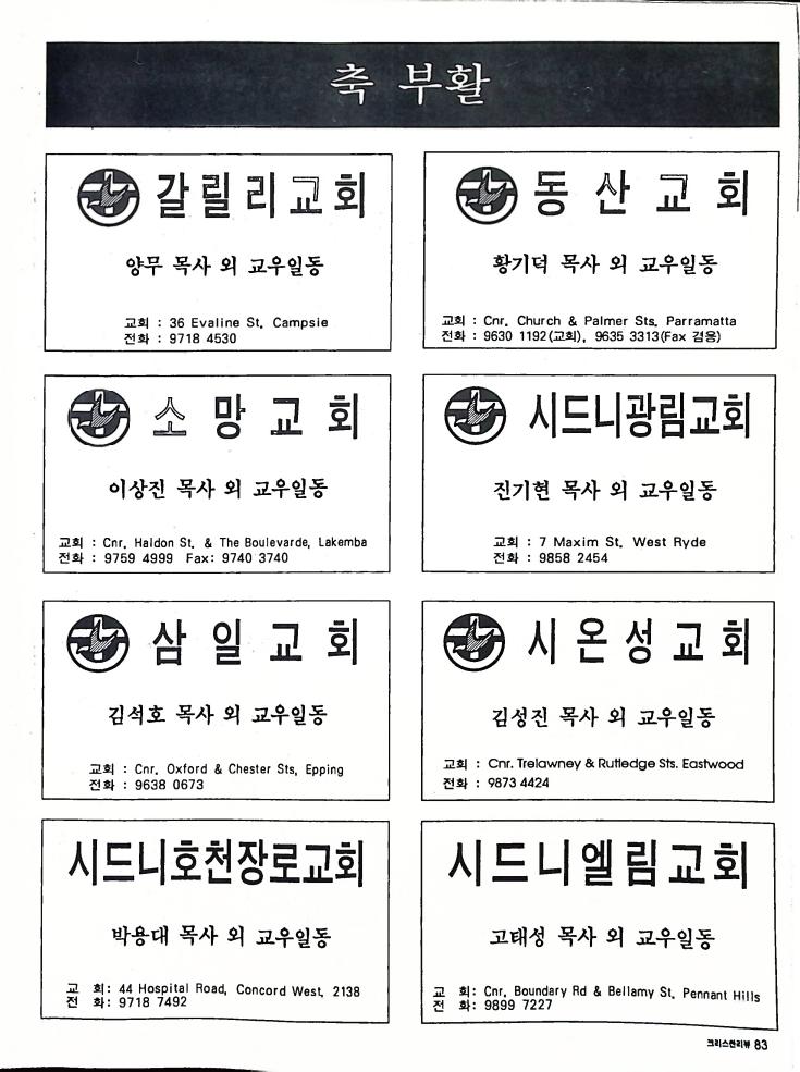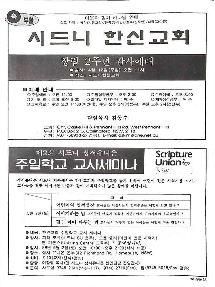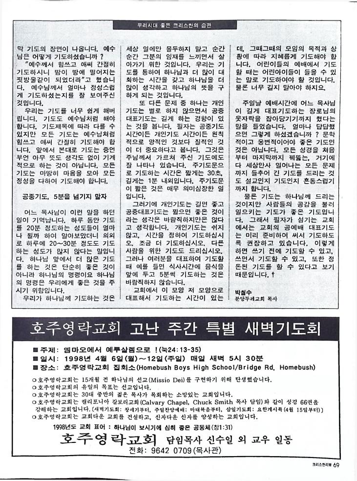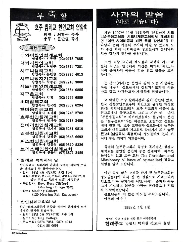 호주에서 1990년 1월부터 제작된 크리스찬 리뷰는 굳건한 신앙의 터전위에 교파를 초월한 신앙공동체로서 복음을 널리 전하기 위한 선교의 목적을 갖고 창간되었다. 4월의 생각-부활절과 부활의 실제 / 현장취재-동성애자들의 축제 마디 그라 / 기획특집-남북한 해외 한인교회 지도자들의 한반도 통일과 나눔을 위한 심포지움 / 지상중계-IMF와 기독교 / 지상중계-제30회 국가조찬기도회