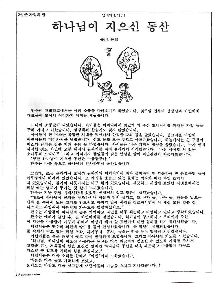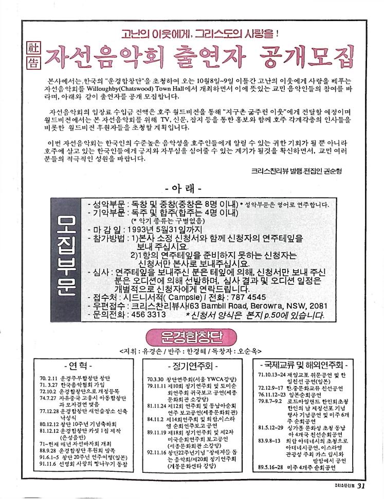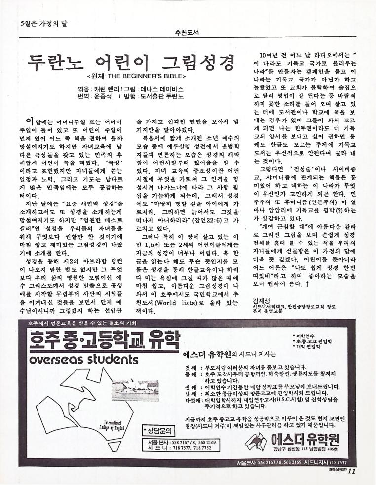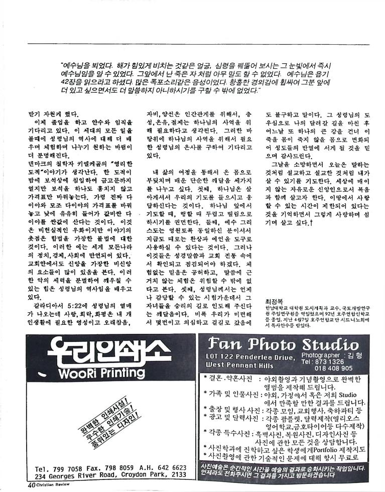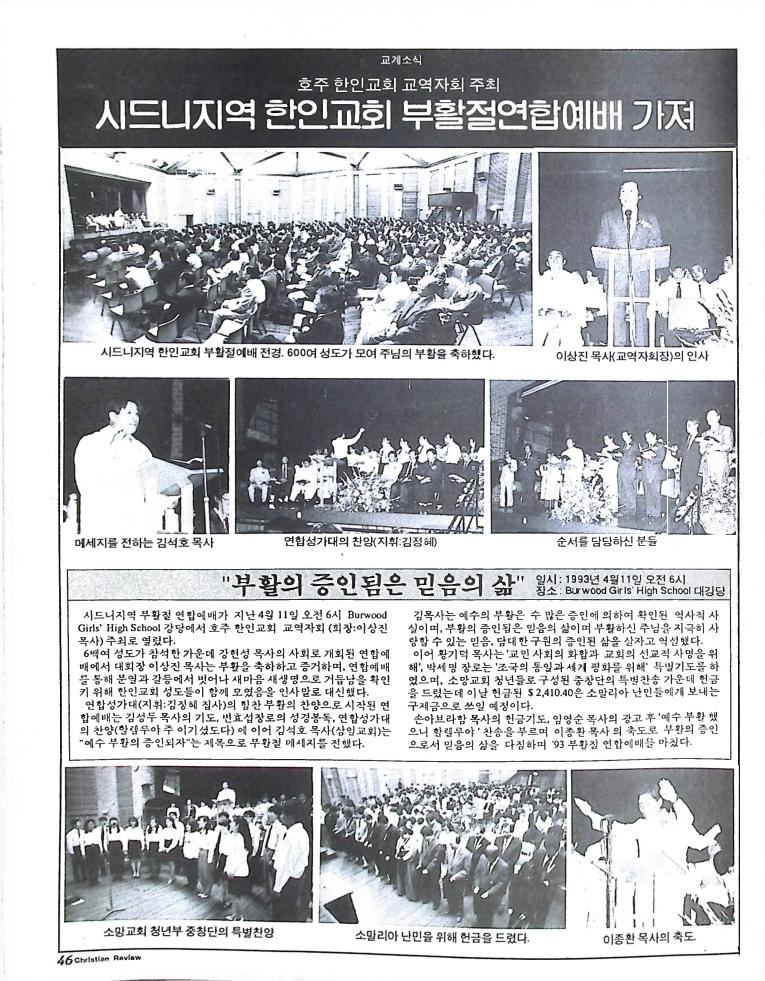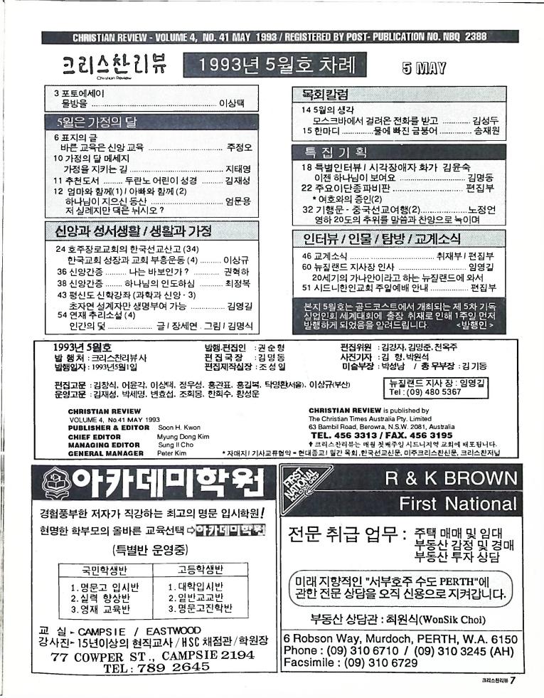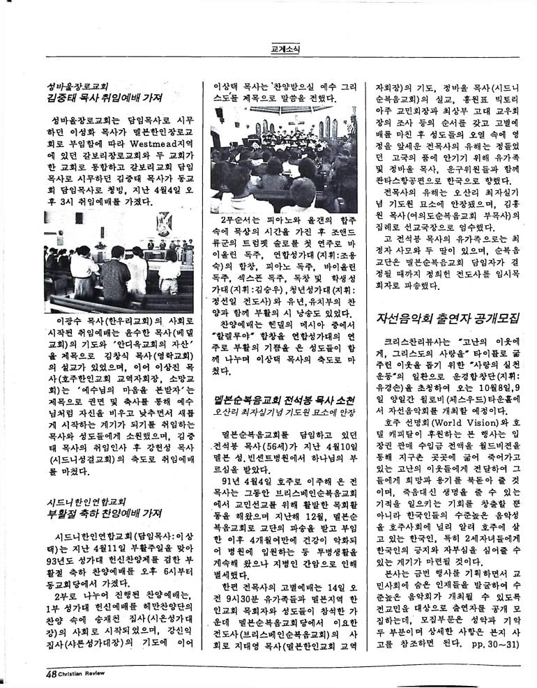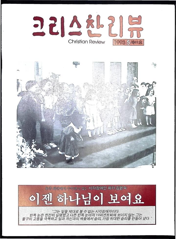 호주에서 1990년 1월부터 제작된 크리스찬 리뷰는 굳건한 신앙의 터전위에 교파를 초월한 신앙공동체로서 복음을 널리 전하기 위한 선교의 목적을 갖고 창간되었다. 가정의달 메세지-가정을 지키는 길 / 5월의 생각-모스크바에서걸려온 전화를 받고 / 특별인터뷰-시각장애자 화가 김윤숙 / 기행문-중국선교여행