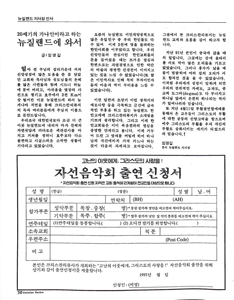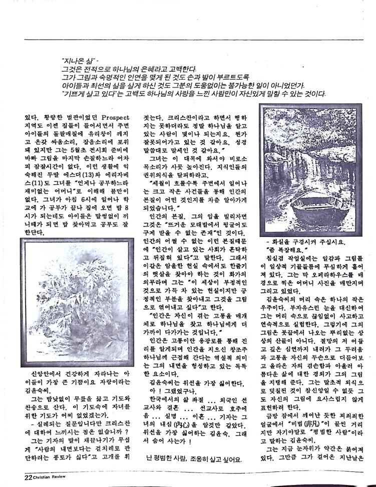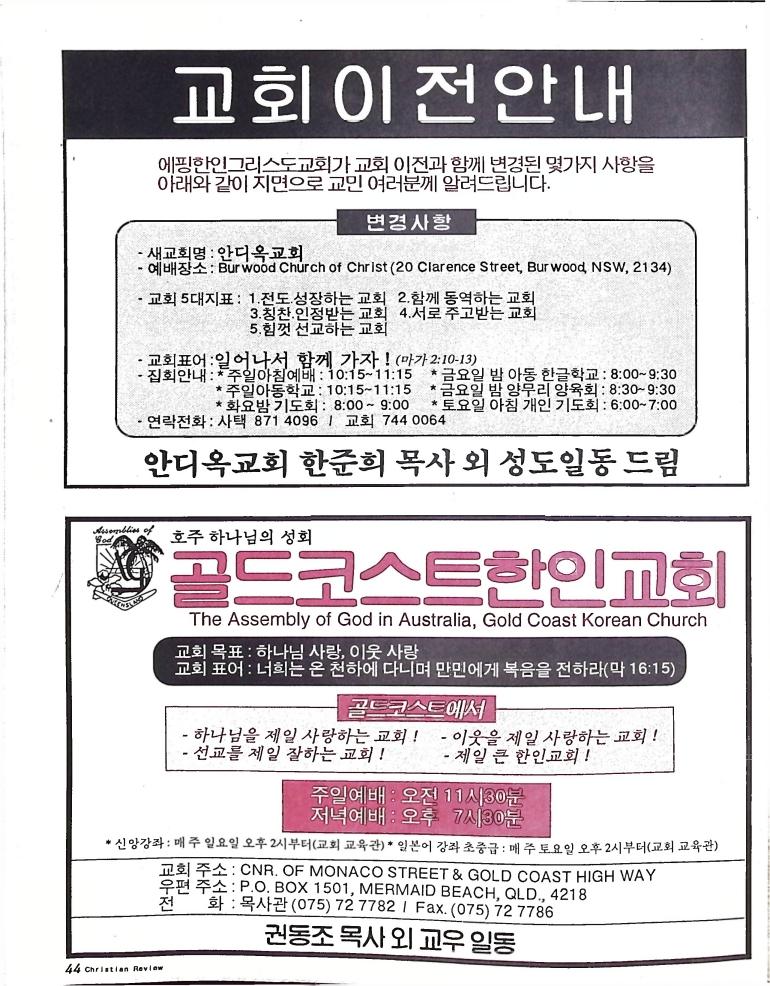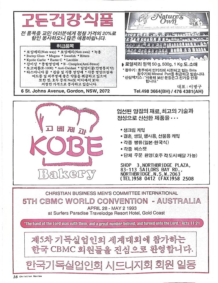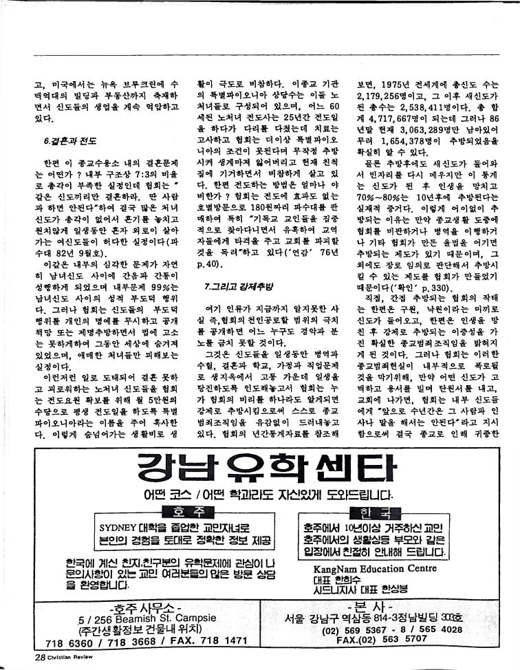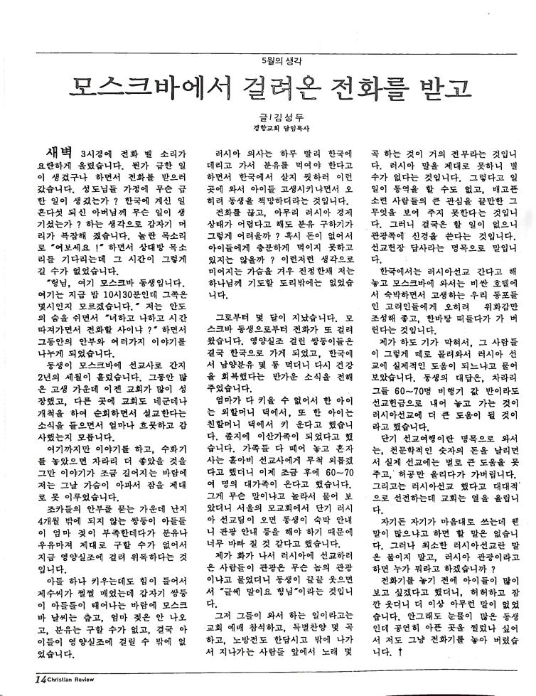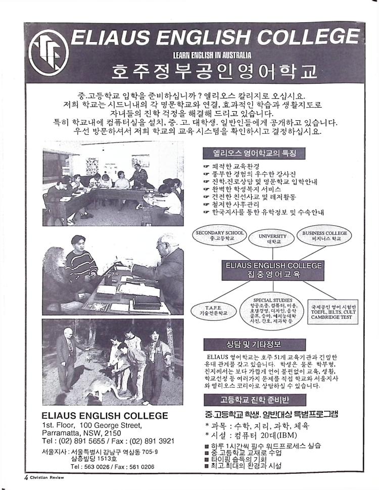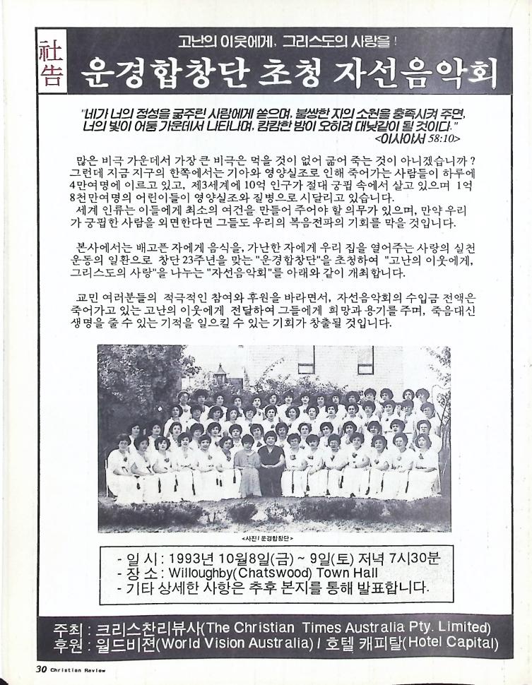 호주에서 1990년 1월부터 제작된 크리스찬 리뷰는 굳건한 신앙의 터전위에 교파를 초월한 신앙공동체로서 복음을 널리 전하기 위한 선교의 목적을 갖고 창간되었다. 가정의달 메세지-가정을 지키는 길 / 5월의 생각-모스크바에서걸려온 전화를 받고 / 특별인터뷰-시각장애자 화가 김윤숙 / 기행문-중국선교여행