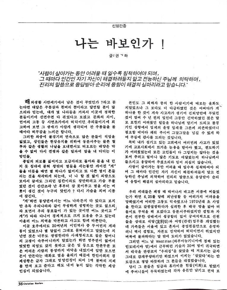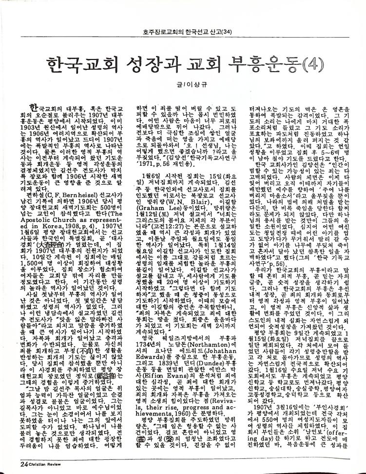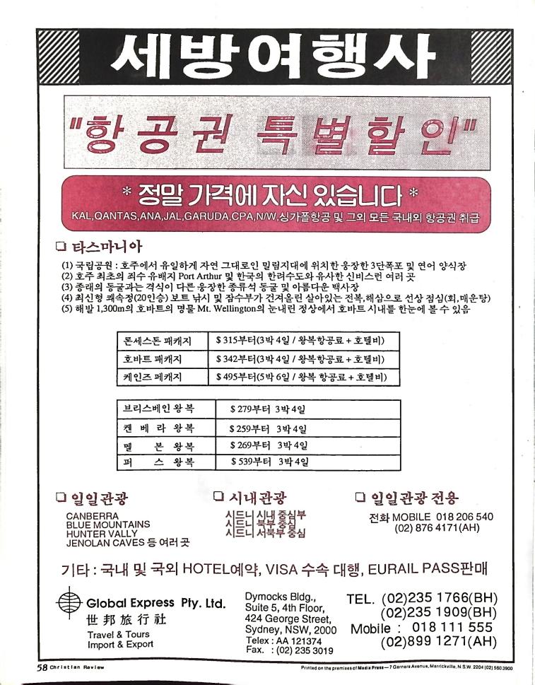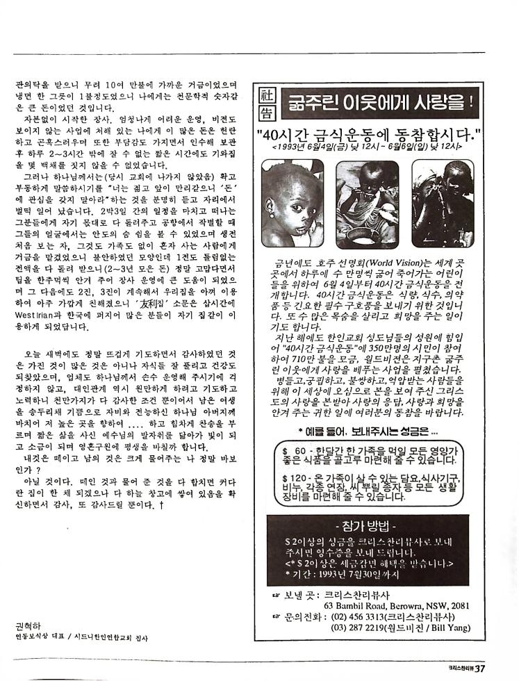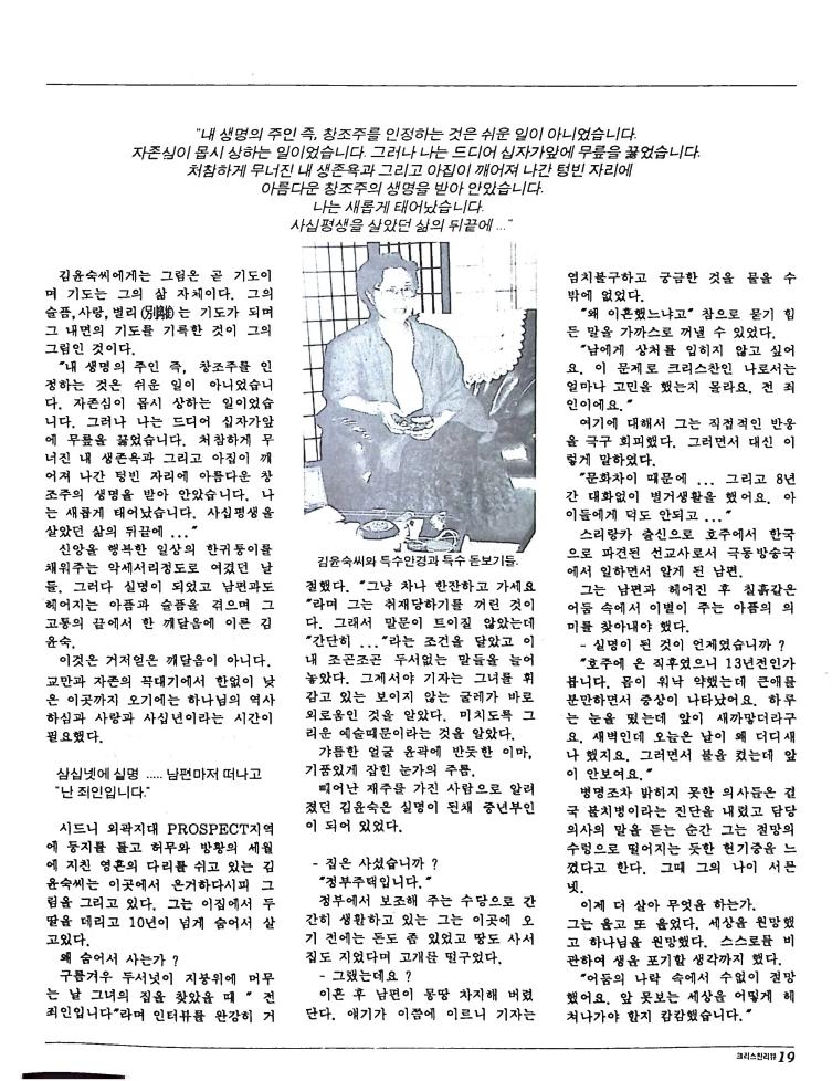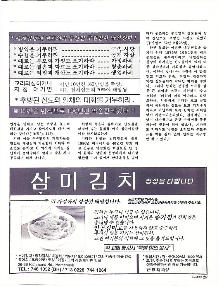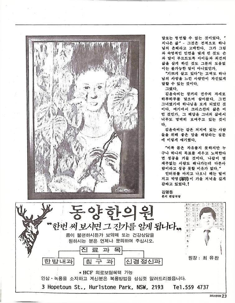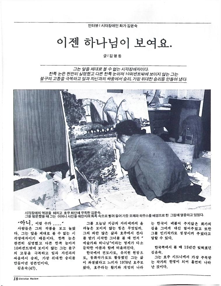 호주에서 1990년 1월부터 제작된 크리스찬 리뷰는 굳건한 신앙의 터전위에 교파를 초월한 신앙공동체로서 복음을 널리 전하기 위한 선교의 목적을 갖고 창간되었다. 가정의달 메세지-가정을 지키는 길 / 5월의 생각-모스크바에서걸려온 전화를 받고 / 특별인터뷰-시각장애자 화가 김윤숙 / 기행문-중국선교여행