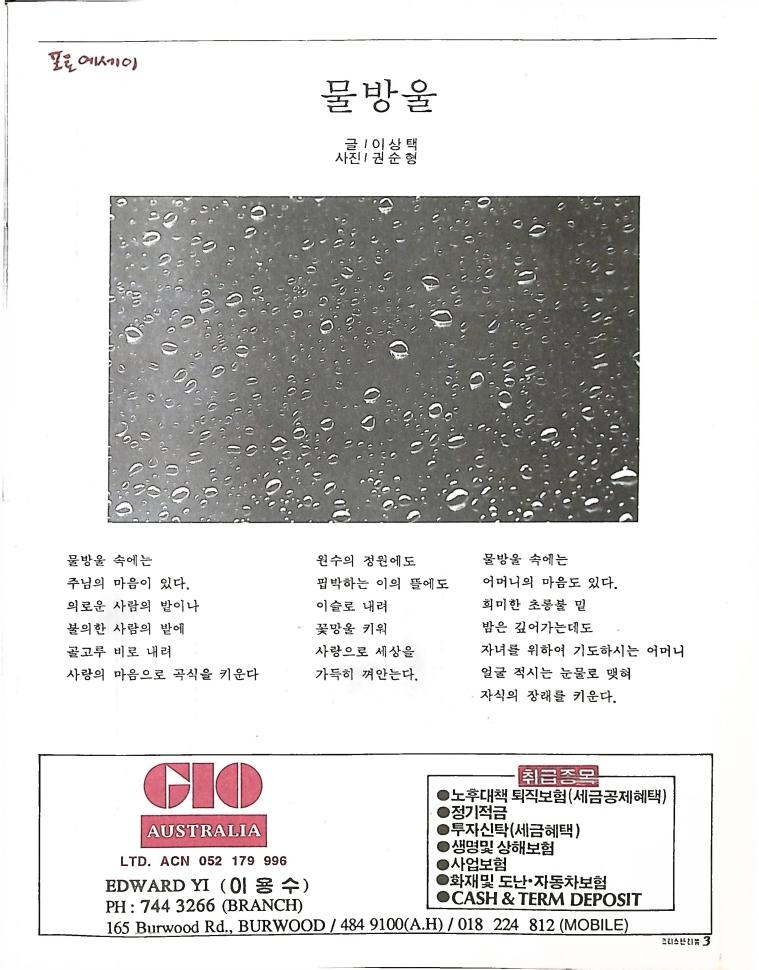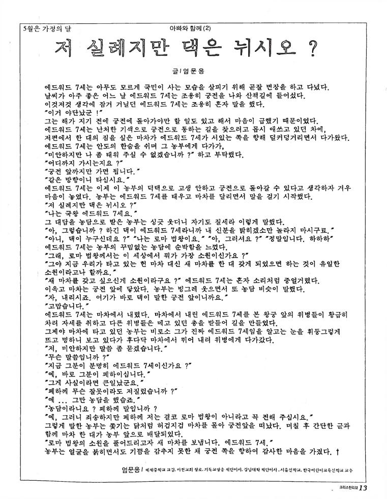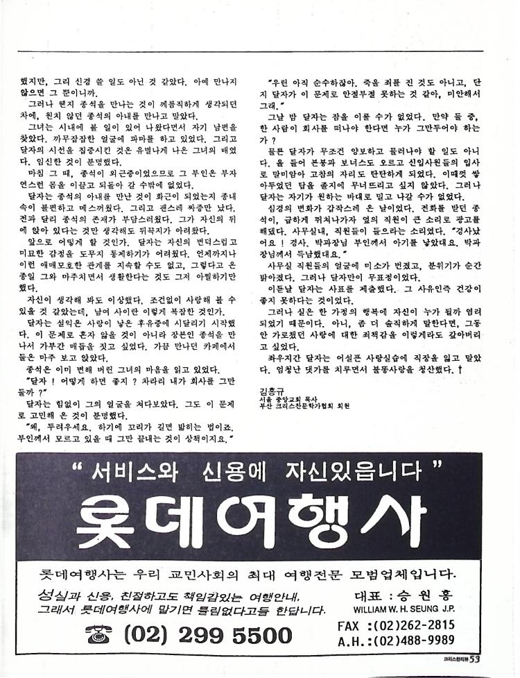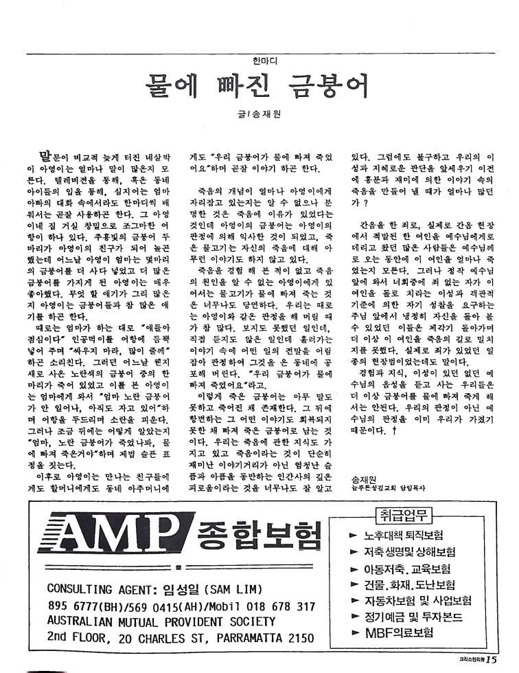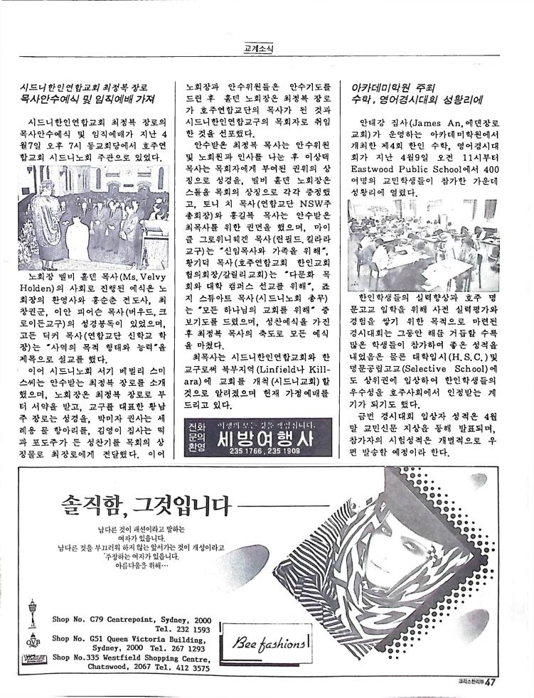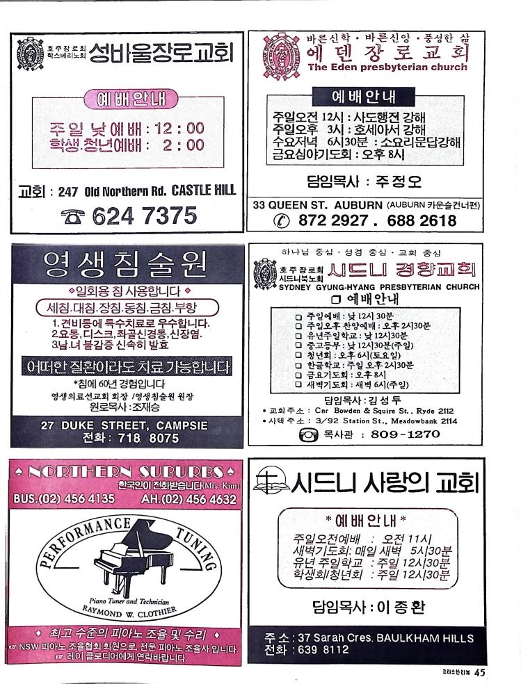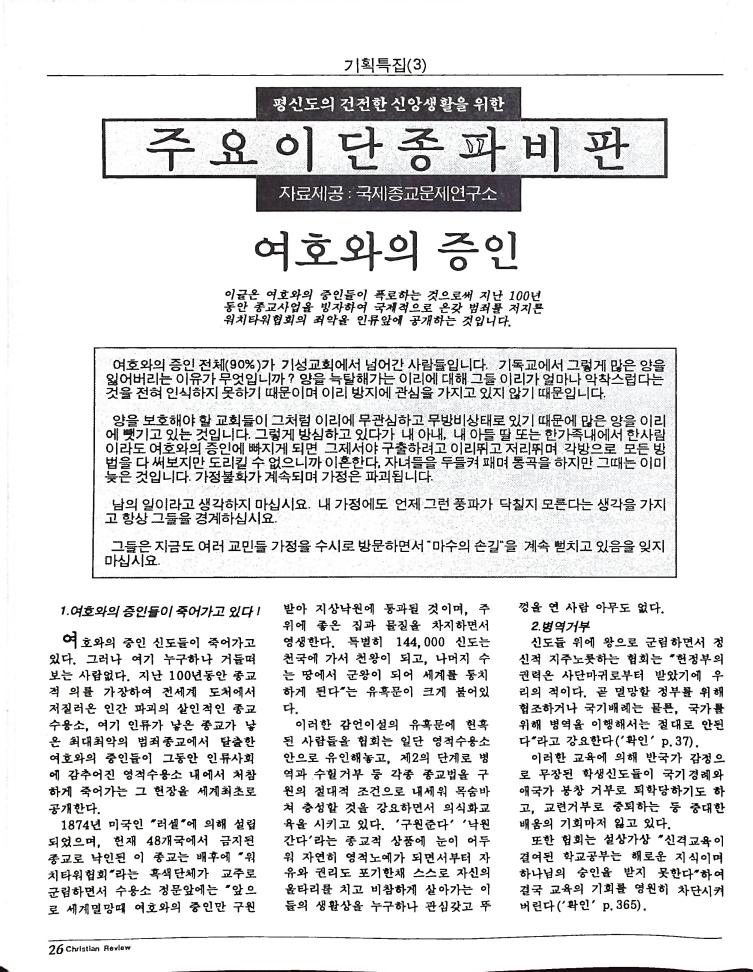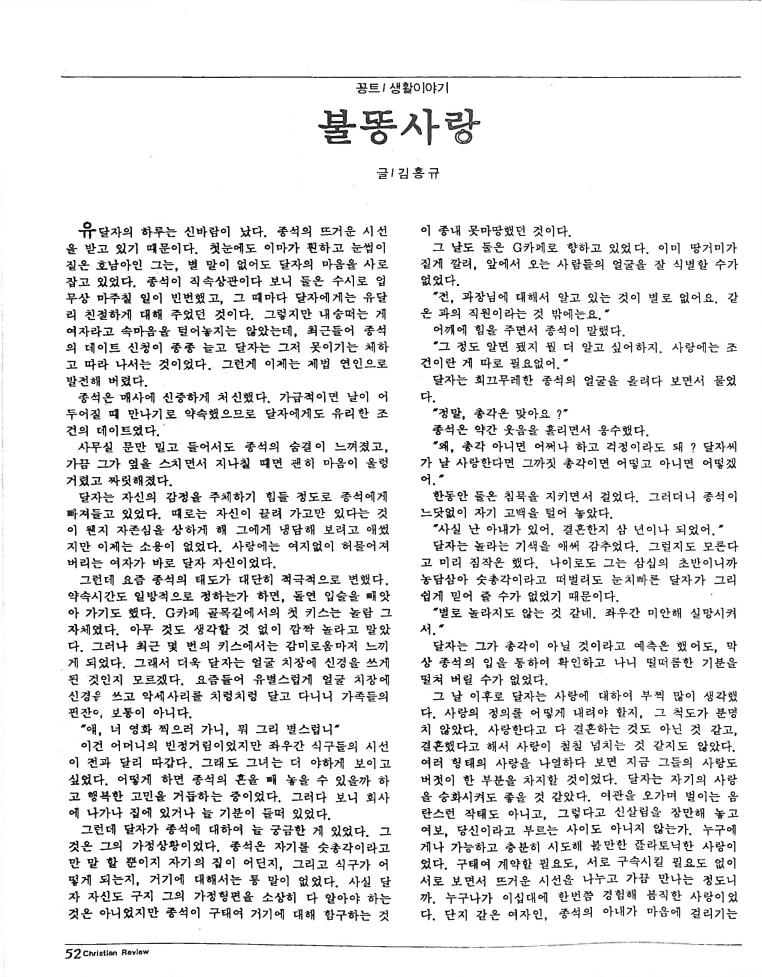 호주에서 1990년 1월부터 제작된 크리스찬 리뷰는 굳건한 신앙의 터전위에 교파를 초월한 신앙공동체로서 복음을 널리 전하기 위한 선교의 목적을 갖고 창간되었다. 가정의달 메세지-가정을 지키는 길 / 5월의 생각-모스크바에서걸려온 전화를 받고 / 특별인터뷰-시각장애자 화가 김윤숙 / 기행문-중국선교여행