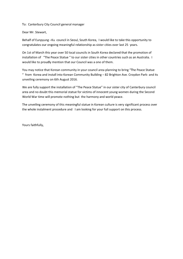 캔터베리시와 자매도시를 맺고 있는 서울 은평구의회가 2016년 8월 6일에 열리는 브라이튼 애비뉴 크러이던 공원에서 열리는 평화의 소녀상 제막식에 협조와 지지를 요청하는 글이다