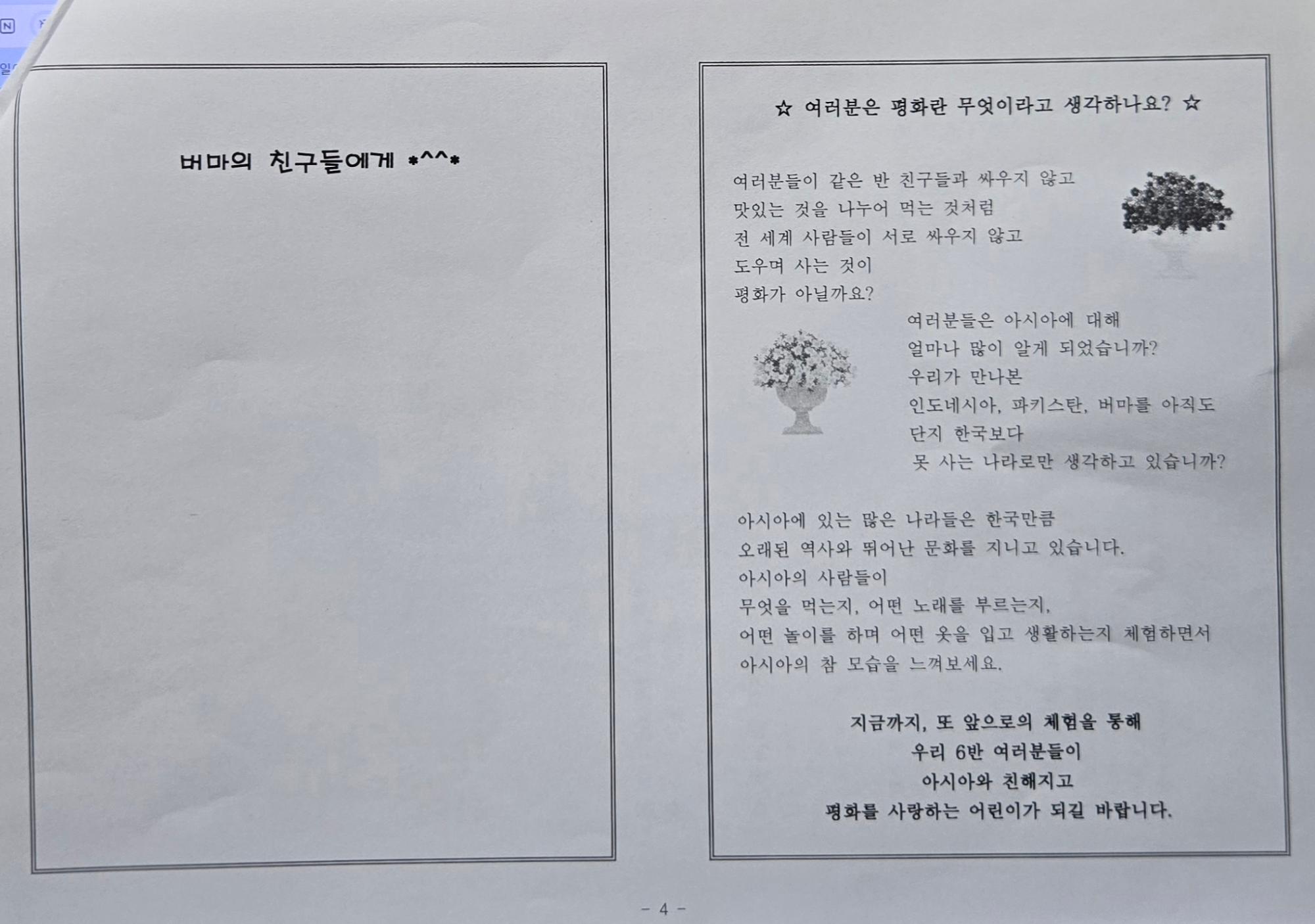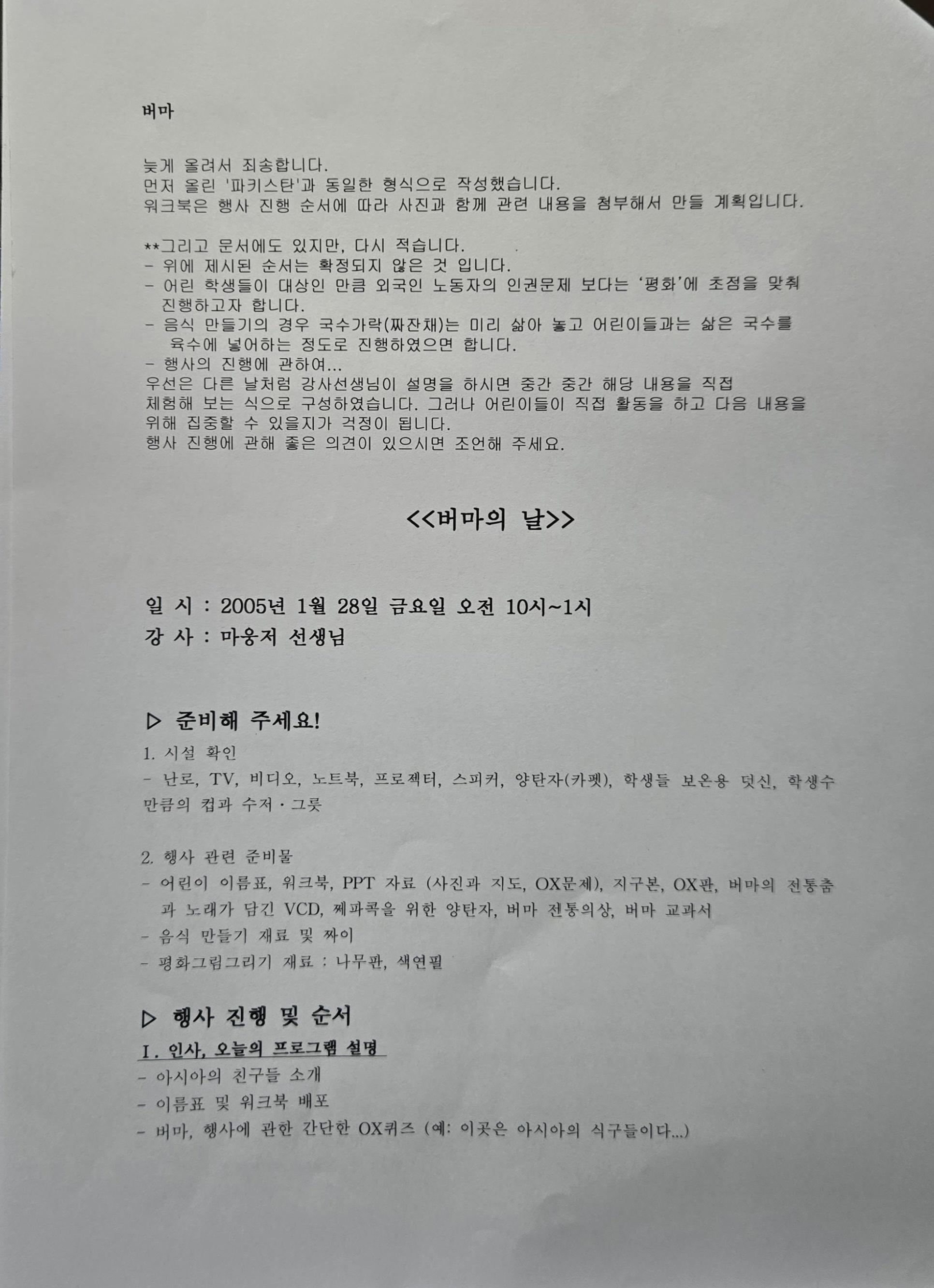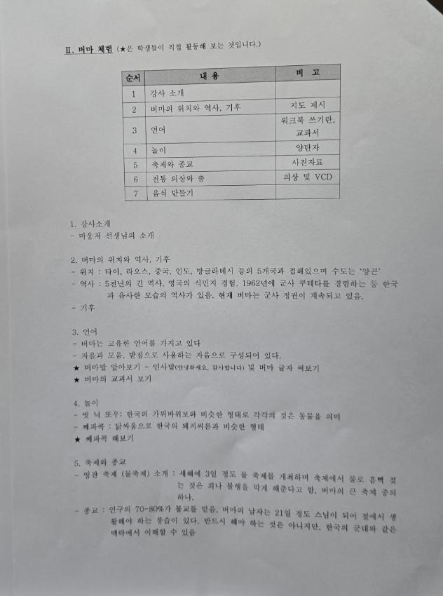 아시아의 친구들에서 이루어진 다문화 가정을 위한 다문화 이해 교육의 일환인 '내친구 아시아' 사업 시리즈 중 버마에 대한 이해교육 자료와 행사 진행을 위한 설명 및 협조 사항, 진행 순서, 프로그램 내용등에 대한 설명서가 담겨있다
