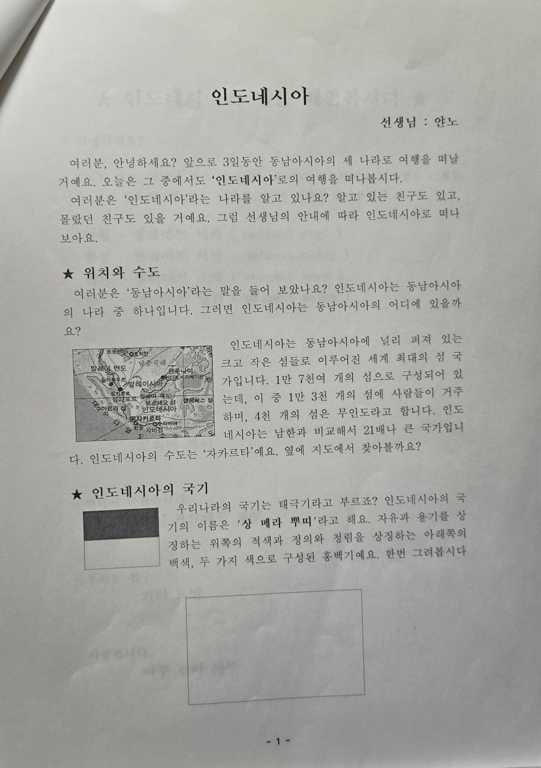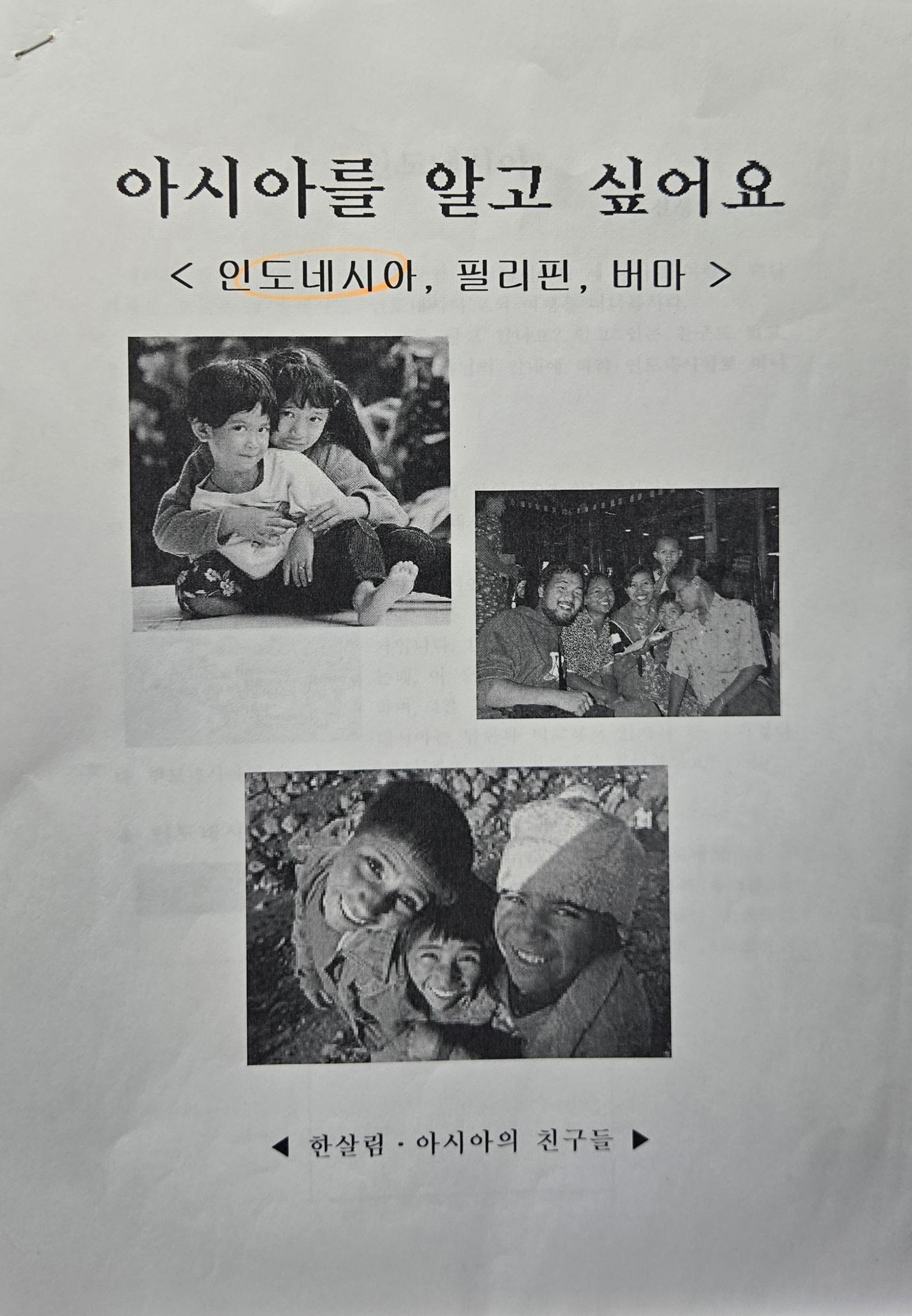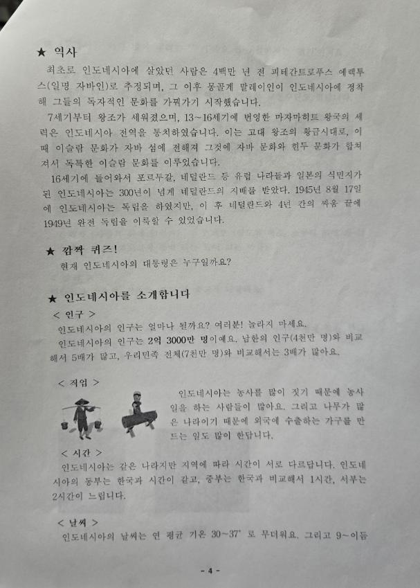 한살림과 아시아의 친구들이 함께한 아시아를 알고 싶어요(인도에시아 / 필리핀 / 버마 ) 사업 중 얀노 선생님이 만든 인도네시아에 대한 교재이다. 인도네시아에 대한 소개, 인사말, 역사, 민요 (동요), 놀이등과 나시고랭 요리법 등을 싣고 있다