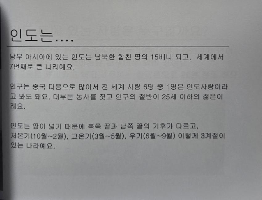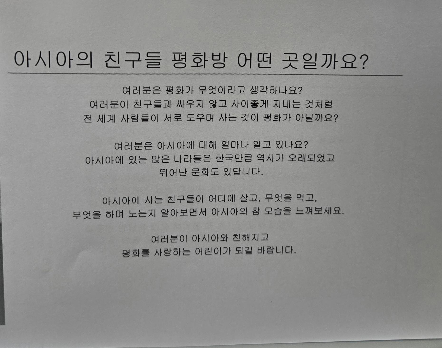 아친에서 평화교육 확산을 위해 사무실 공간을 개조해 만든 공간인 평화방의 2006년 봄 어린이 평화교육 교재중 <인도와 친구해요> 이다 인도 인사말, 인도에 대한 소개, 종교, 축제, 전통 옷, 음식등 다양한 인도의 문화에 대해 소개하고 있다