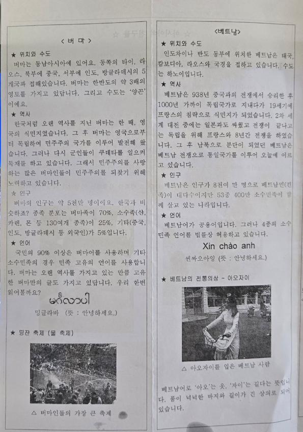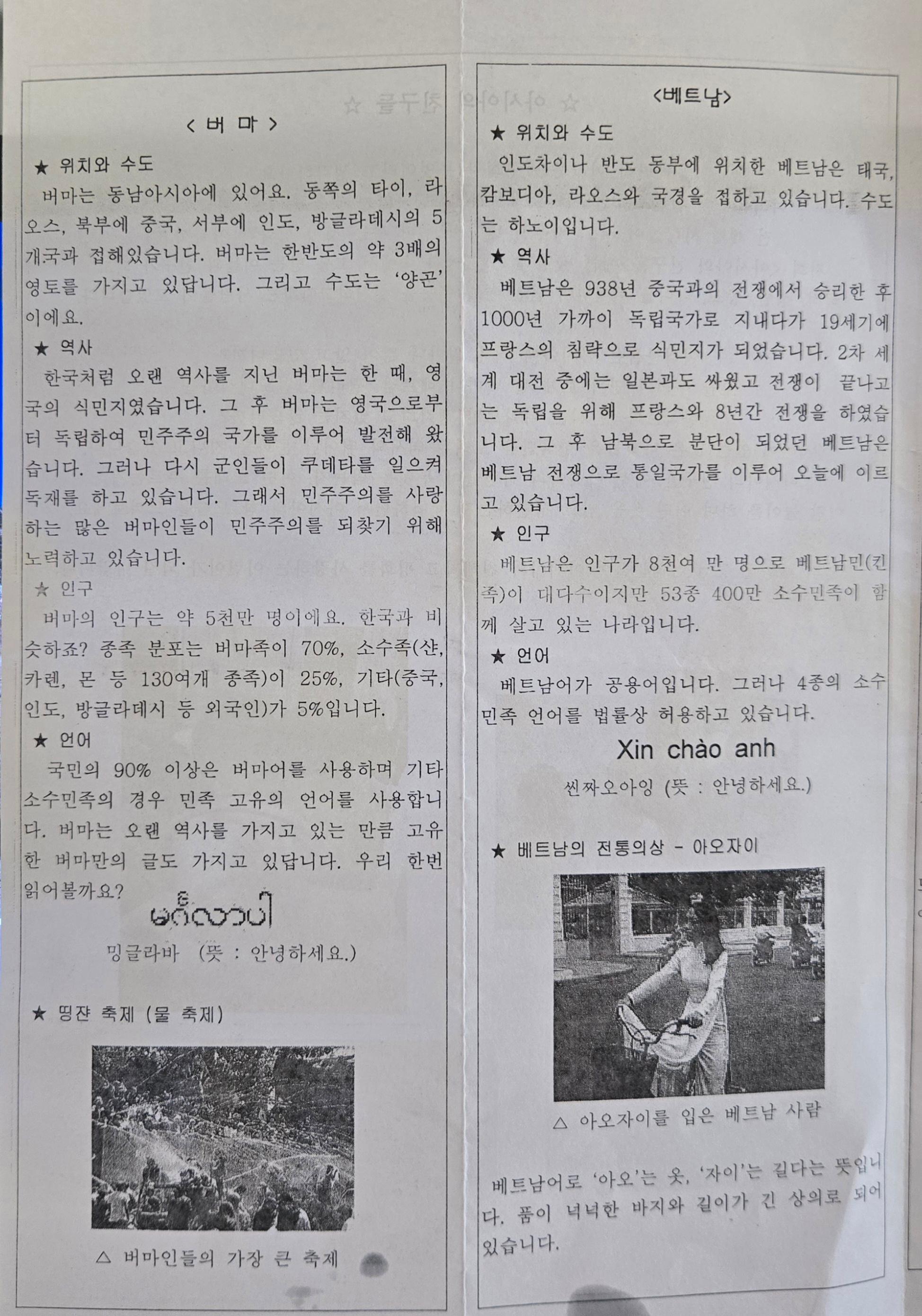 아시아의 친구들에서 평화교육 확산을 위해 사무실 공간을 개조해 만든 공간인 평화방에서 인천 YMCA와 함께 아시아와 친해지고 평화를 사랑하는 어린이로 자라길 바라는 마음으로 마련한 프로그램이다 아시아에 있는 이웃 나라 중 버마, 베트남, 인도네시아, 필리핀에 대한 소개를 하고 있다
