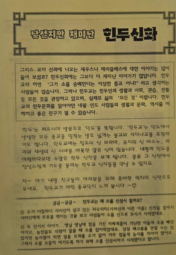 아시아인권문화연대 2006 이주노동자축제 네팔부스에서 만든 자료로 힌두인의 생활과 사회, 관습, 전통등 모든 것을 관장하는 힌두교와 힌두문화에 대한 이해를 재미있게 돕고자 만든 자료이다
