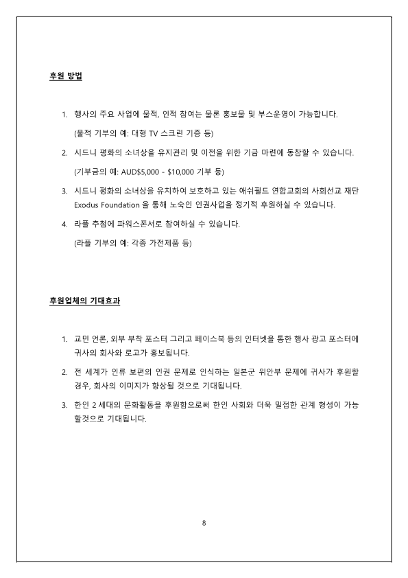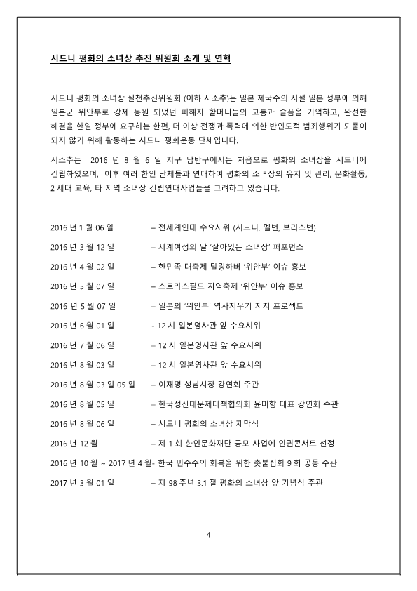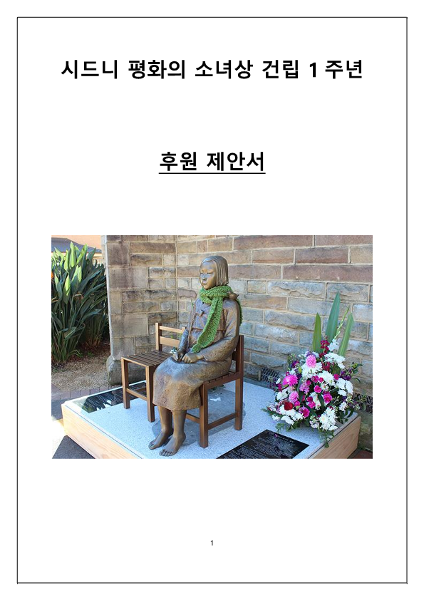 2017년 8월 5일에 있을 시드니 평화의 소녀상 건립 1주년 기념 행사에 앞서 시소추 박은덕, 강병조 대표의 인사말 /시드니 평화의 소녀상 추진 위원회 소개 및 연혁 / 시드니 평화의 소녀상 건립1주년 기념식 의의와 목적 / 1주년 기념행사 기획 (기념식 및 평화 콘서트와 바자회) / 후원 방법 / 행사 포스터 등을 포함한 후원 요청서이다