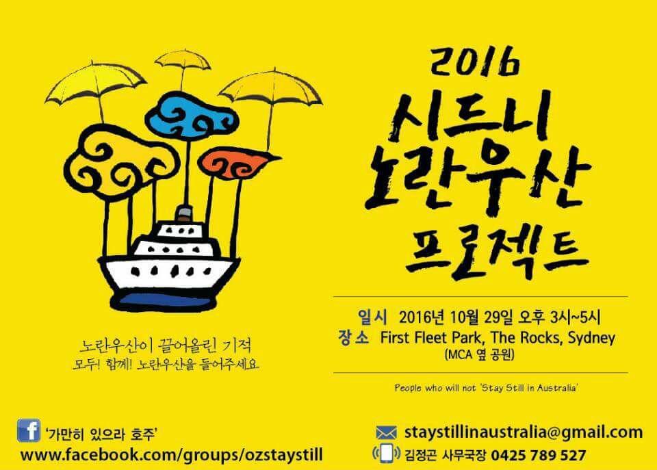 2016년 10월 29일 First Fleet Park, The Rocks, Sydney에서 있었던 세월호를 기억하기 위한 노란우산 프로젝트의 포스터와 사진이다
