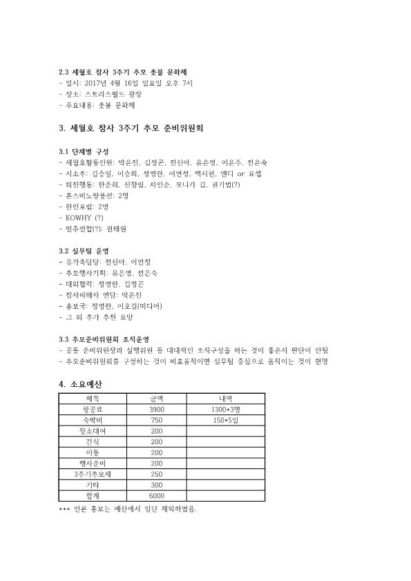 세월호 참사 3주기를 맞아 성공적인 행사를 위한 단체 명칭 변경, 세월호 참사 3주기 추모 사업, 세월호 참사 3주기 준비위원회 구성, 소요 예산 등에 대한 구체적인 사안을 담은 제안서이다
