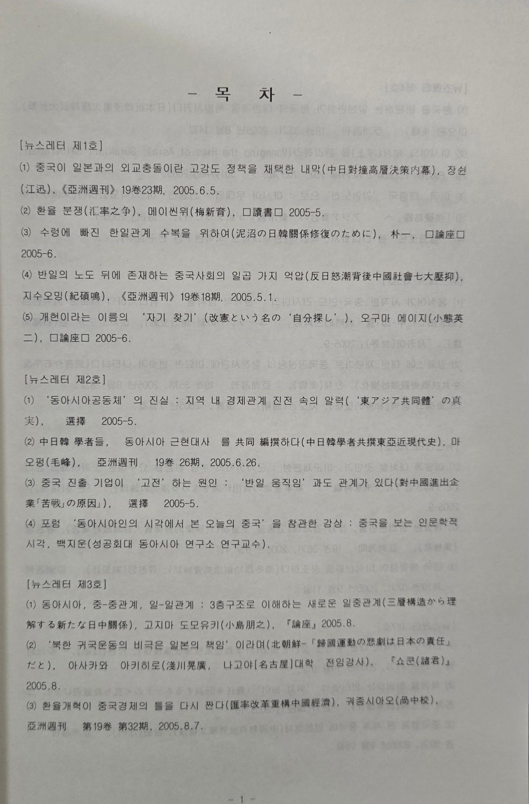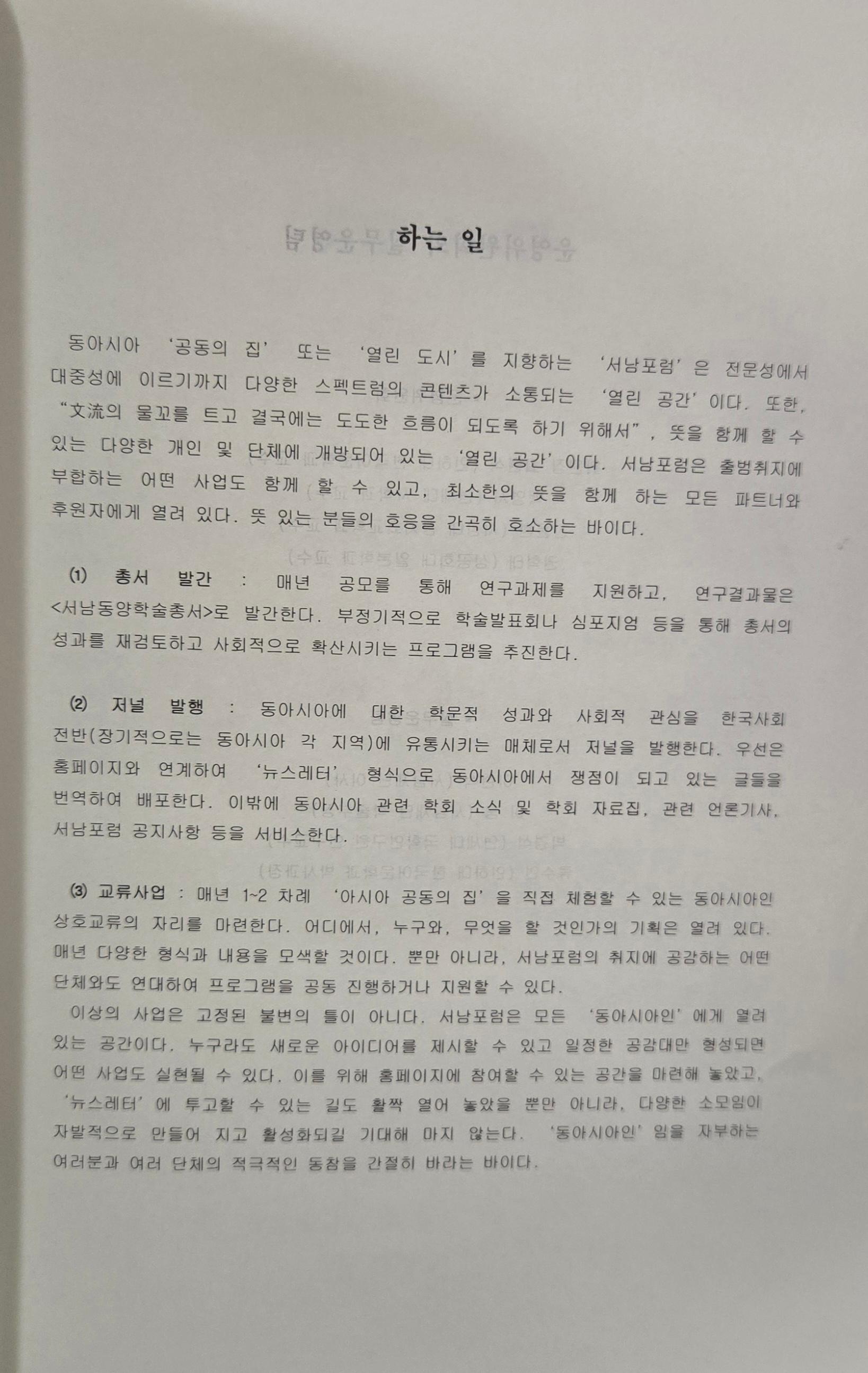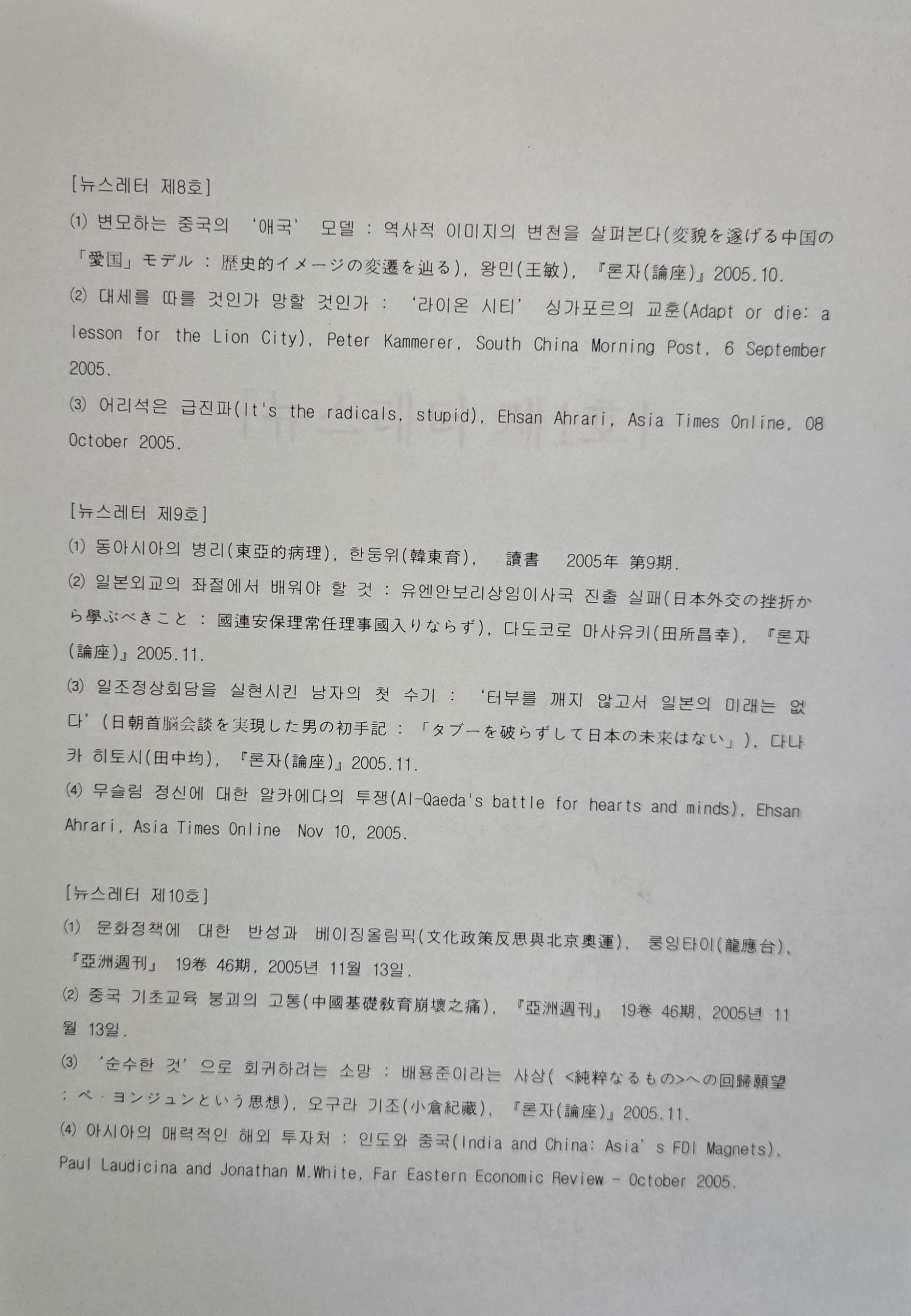 동아시아를 하나의 학문적 사유단위로 삼는 서남포럼에서 저널사업의 일환으로 발행한 뉴스레터 모음집 이다. 뉴스레터는 중국, 일본, 대만, 홍콩, 동남아 등에서 발행된 주요 잡지를 검색하여 주목할 만한 글을 번역해 싣고, 동아시아 관련 학계동향 및 학회 소식, 학회 자료집, 관련 언론기사, 서남포럼 공지사항 등을 싣고 있다