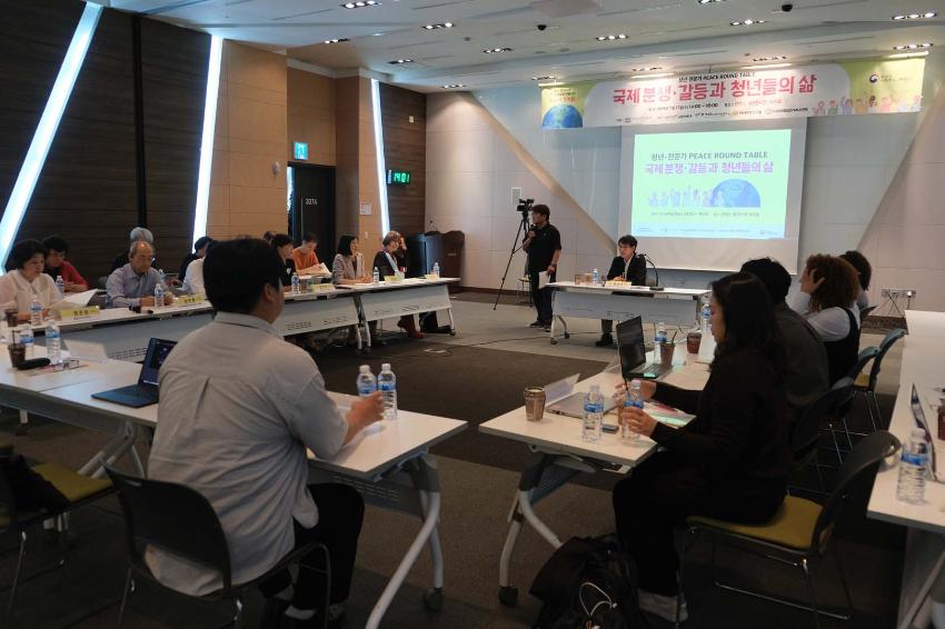 2025년 9월 17일 일산 킨텍스 제2전시장에서 있었던 분쟁과 갈등이 청년들의 삶에 미치는 영향을 알아보고 이를 극복하기 위한 국제사회 청년들의 협력 방안을 모색하는 <청년 · 전문가 평화 ROUND TABLE>행사에 관한 사진이다