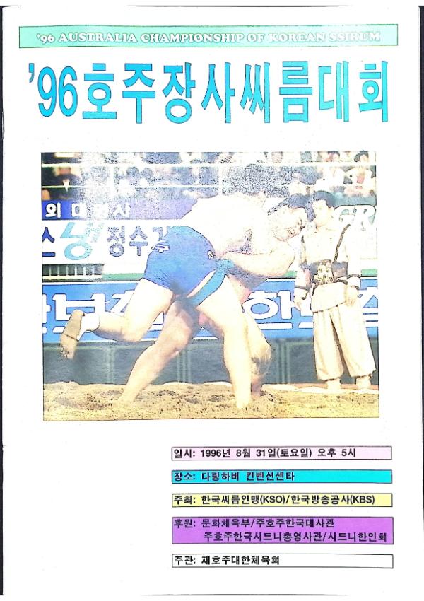 '96호주장사씨름대회 개최를 홍보하며 한국 민속씨름 기술과 경기에 대해 설명한 자료이다