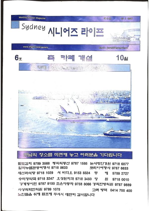 시드니 노인들의 만남의 장소인 카페를 개설하면서 / 추석 명절을 맞이하여 / 건강수명을 늘려야 한다 / 건강을 바란다면 잠부터 자라 / 감기가 환절기에 잦은 이유는 / 화병 / 최고의 유산을 남기는 법 / 당뇨병 노인의 근육만들기