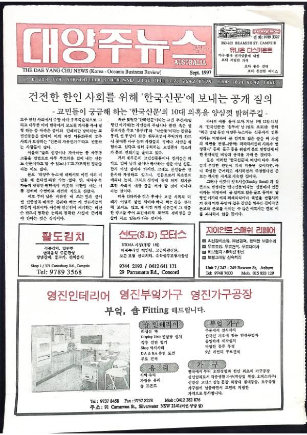 건전한 한인사회를 위해 '한국신문'에 보내는 공개질의 / CENTRLINK 출범 / '97 한인의 날 행사 / NSW주정부 한국어 토요학교 후원회 모임 / 호주연합교단내 단독 한인교회 노회 신설을 반대한다 / 학교 학원 안내 - 켄트칼리지 / 한국인 전화공사 구장완씨 통신분야 생활 - 반세기 / 김삼오 박사의 알짜배기 유학가이드