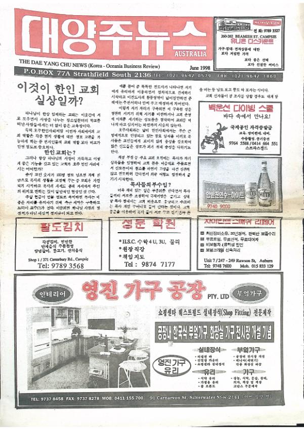 이것이 한인교회 실상일까? / 한인사회를 계속 오도하는 '한국신문' / 한국신문과 같은 월간조선 - 한국인들을 현혹하는 위험한 논리 / 백건우 피아니스트 오페라하우스에서 연주 / 텔스트라 주말 국제화요금 대폭 인하 / 은퇴연금에 관한 중요한 변경사항 / 호주 한인복지회 홍보란 / 한인회의 장래를 생각하며, / 한국신문에 게재된 독자투고에 대하여 / 이것을 알고 계시나요? - 전화이용 안내편(1)