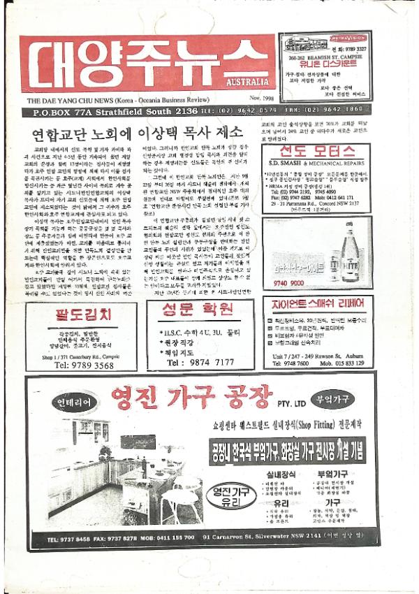 연합교단 노회에 이상택목사 제소 / 뉴싸우스 웰스 피부 미용업계 비상 - 무자격 수술 및 과당 광고 피해로 / 본보 창간 11주년기념 원더랜드 특별할인권 판매 시작 / 휠체어농구대회 우승팀 - 남자 미국, 여자는 캐나다 / 홍역 - 십대와 학령전 아동 위험해 예방접종 철저히 / 김대통령 중국방문에 아시아나 항공 / 사설 - 영혼을 괴롭히는 장노목사의 먹이사슬 / 독자의 광장 - 고함소리 우렁찬 한인회, 한인회는 한인사회의 공해