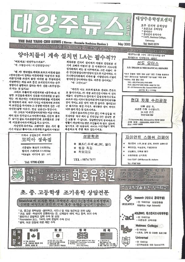 양아치들이 계속 설치면 LA는 필수적??? / 김영주군 100M에서 금메달 / 이재경양아치회 또다시 폭력 협박으로 한인사회에 공포분위기 조성!!! / 무료 교육 정보의 날 성황리에 개최 / 이민자 마케팅 시상자 모집 캠페인 / 한인사회를 계속 오도 기만하는 <한국신문> /호주동아 발행인 오직일귀하 / 대양주뉴스에 댜한 동포사회의 시각 / 사설 - 조직 푝력 근절하자 / 1인3역하는 ABACI 박윤옥 회계사 / 독자의 광장 - 특정지역 사투리로 글을 쓰지 않기 바란다