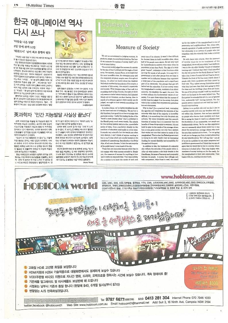 호주에서 2011년 8월 5일 발행된 The Kaussie Times 제3호로 록뮤직 페스티벌 'ROCKOR2011' / 제주 - 세계 7대 자연경관 선정기원 국제 영어 Speech 대회 / 한국 애니메이션 역사 다시 쓰나 '마당을 나온 암탉' / Measure of Siciety / 분자 생물학, 중심원리가 깨지고 있다 등의 기사를 싣고 있다