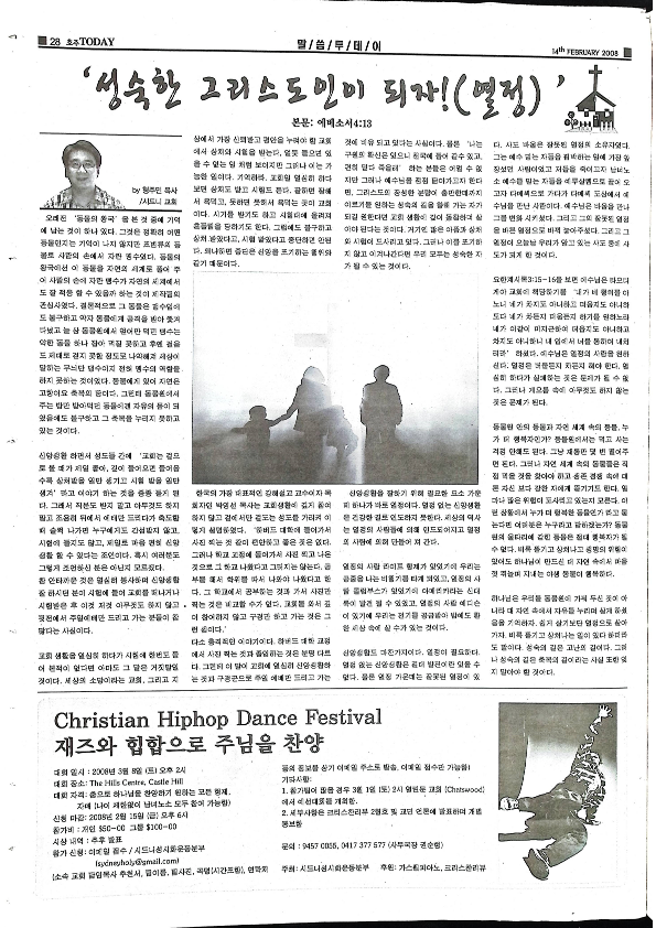 2008년 2월 14일에 발간된 시드니북부지역신문인 호주Today 이다 시드니 북부 지역뉴스 / 호주 뉴스/ 국내 뉴스/ 지구촌 뉴스/ 건강 정보/ 기독교 말씀/ 스포츠 뉴스 / 지역 구인, 구직, 상가정보등을 싣고 있다