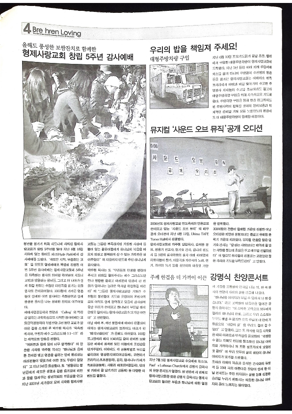호주에서 2006년 10월에 발행된 형제사랑교회의 신문이다 전도축제 뮤지컬 '사운드 오브 뮤직' / 새 예루살렘의 영광에 참여하라 / 형제사랑교회 창립 5주년 감사예배 / 10대를 향한 10대를 위한 교회 / 우리는 예비 선교사, 주의 강한 군사 될 준비 완료! / 싱가폴의 부흥하는 교회들을 방문하고... / 주님의 빛과 함께하는 가정 등을 싣고 있다