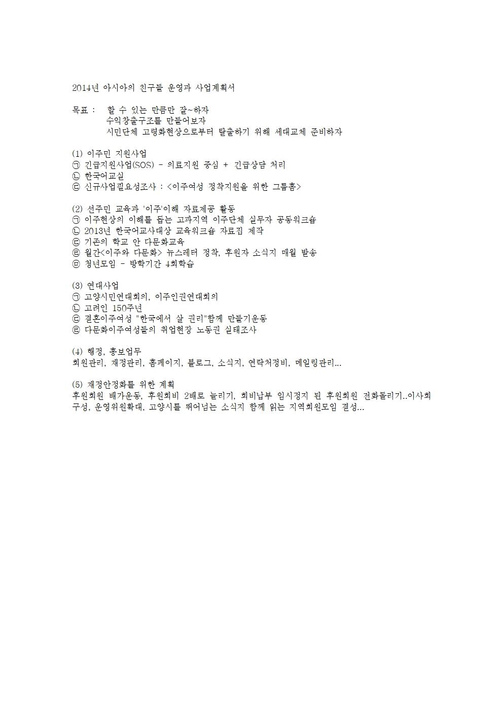 2014년 아시아의 친구들 운영과 사업계획서