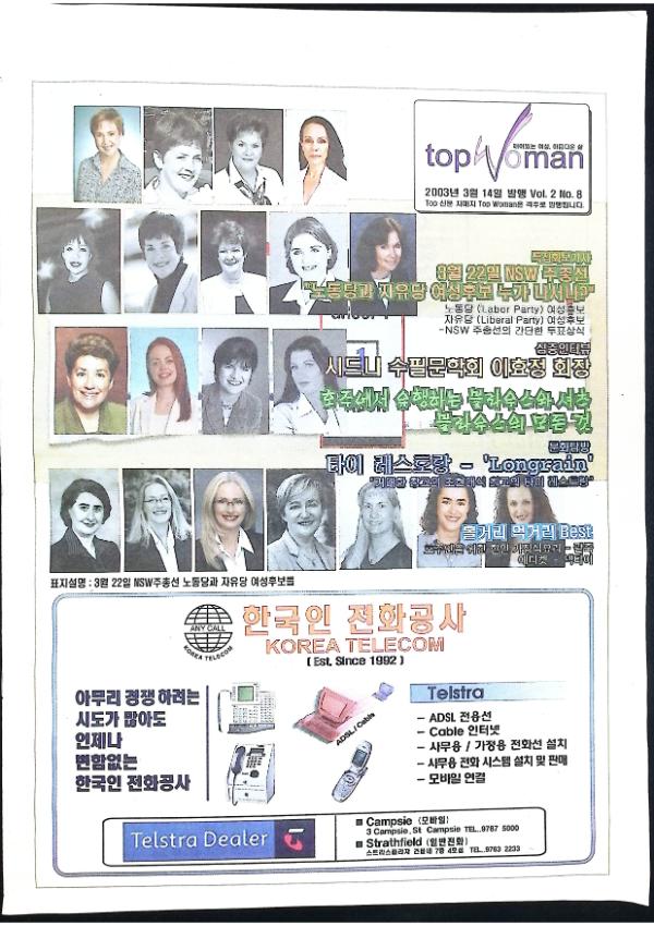 2003년 3월 14일 발행된 top woman Vol.2 No.8호이다 3월22일 NSW주총선 노동당과 자유당 여성후보 누가 나서나? / 손가락으로 바위에 구멍을 내서 글자를 새기듯 글을 썼다 - 시드니 수필문학회 이효정 회장 / 톱 우먼 추천 볼거리 먹거리등이 실려있다