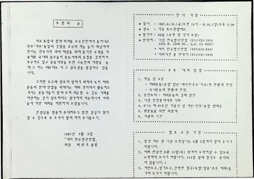 1987년 8월 14일 부터 16일까지 미국 로스엔젤레스에서 재미 한국청년연합에서 마련한 해외동포대회 초청장이다