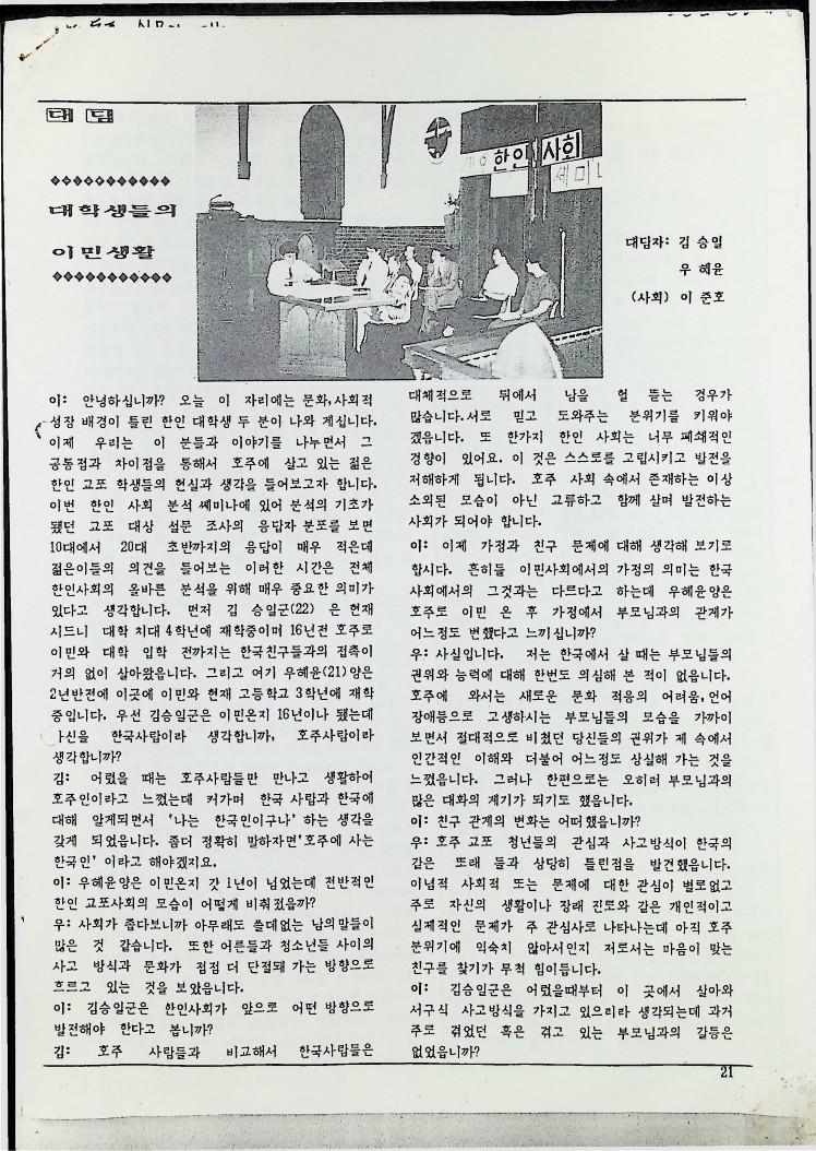 호주 신문에 실린 기사로 대담자 김승일과 우혜윤이 이준호의 사회로 대담한 내용을 싣고 있다