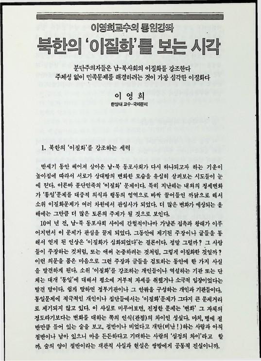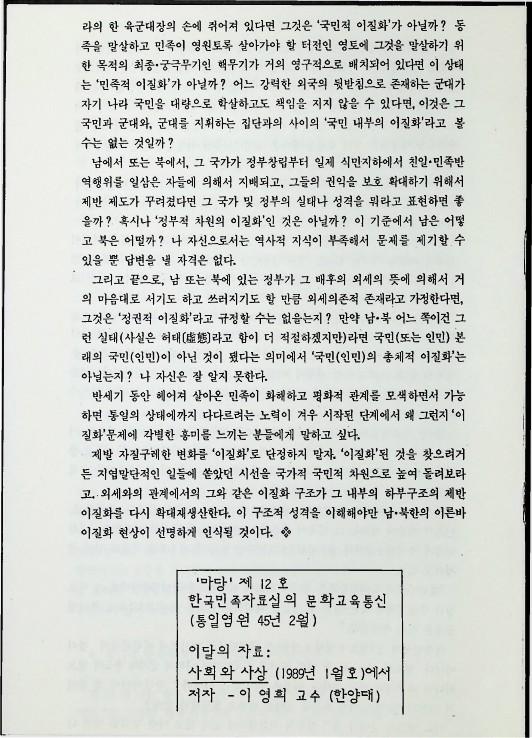 1989년 '마당' 제 12호 한국민족자료실의 문화교육통신에 '이달의 자료'로 인용된 한양대 이영희교수의 사회와 사상(1989년 1월호) 글로 이영희교수의 통일강좌 자료이다
