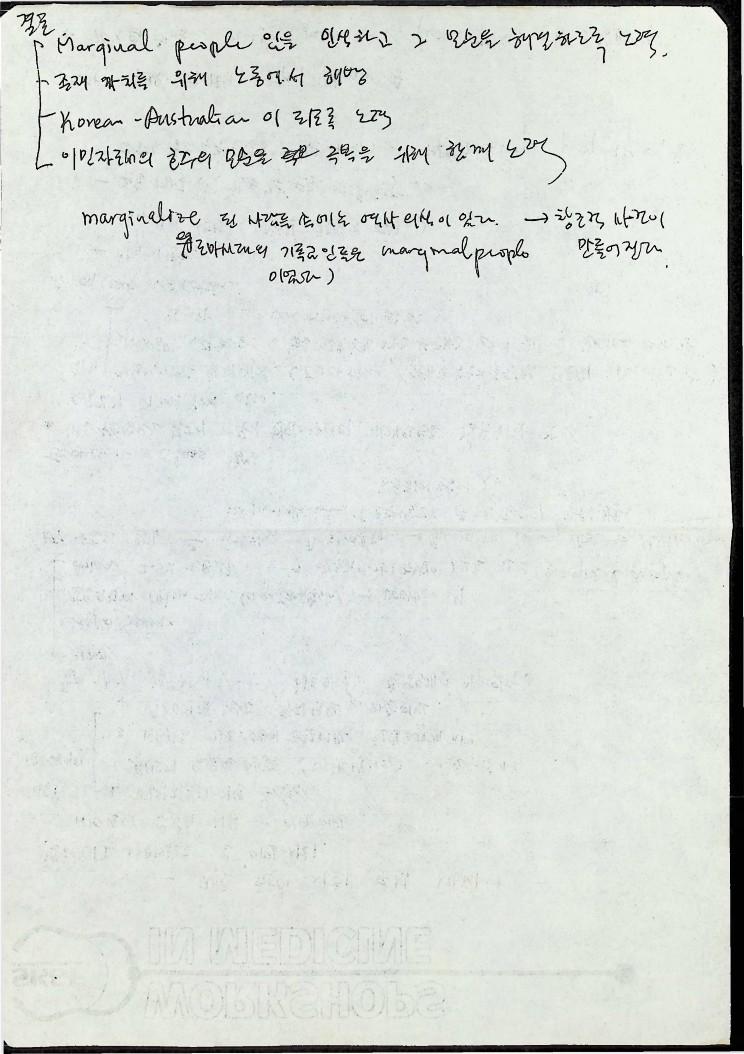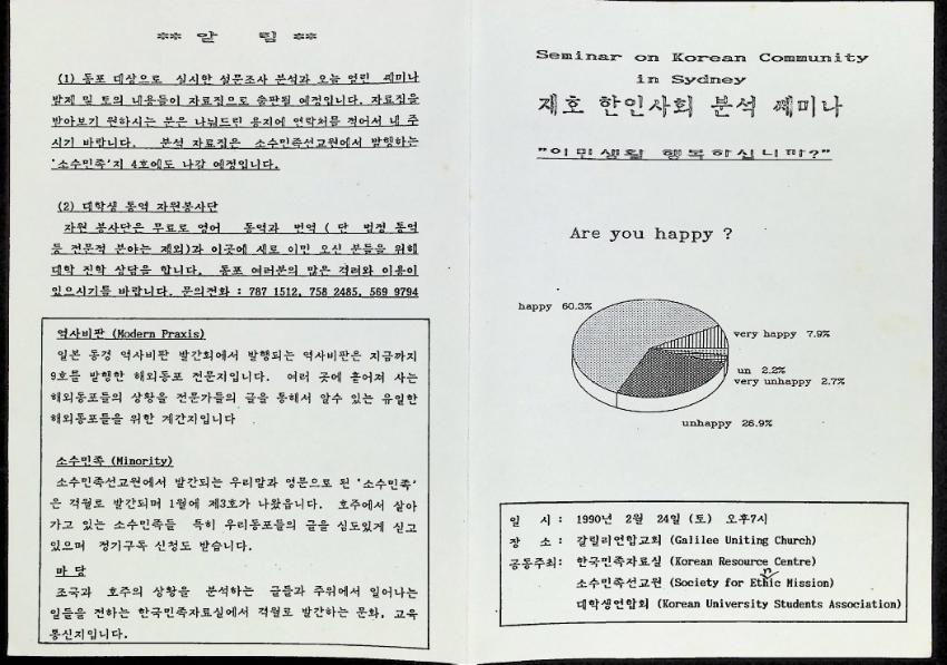 1990년 2월 24일 호주 갈릴리연합교회에서 열린 재호 한인사회 분석 세미나 '이민 생활 행복하십니까?'의 자료와 개인 노트이다 한민족자료실, 소수민족선교원, 대학생연합회 공동 주최이다