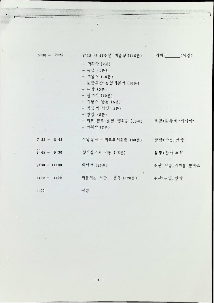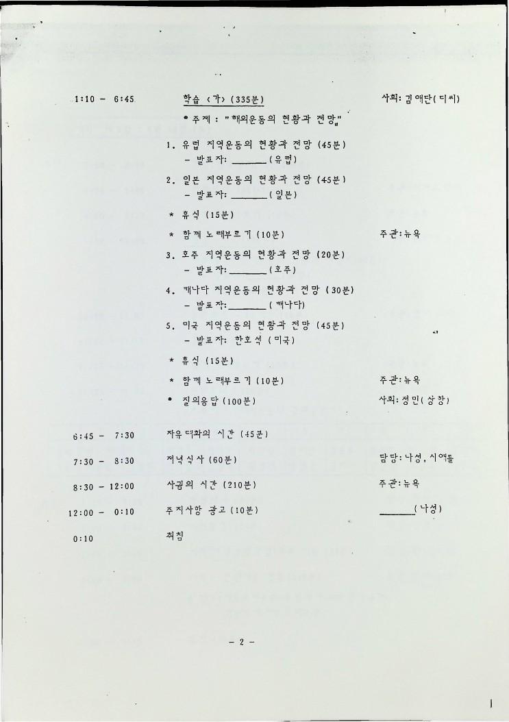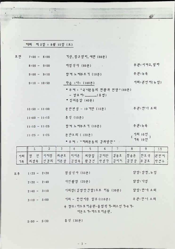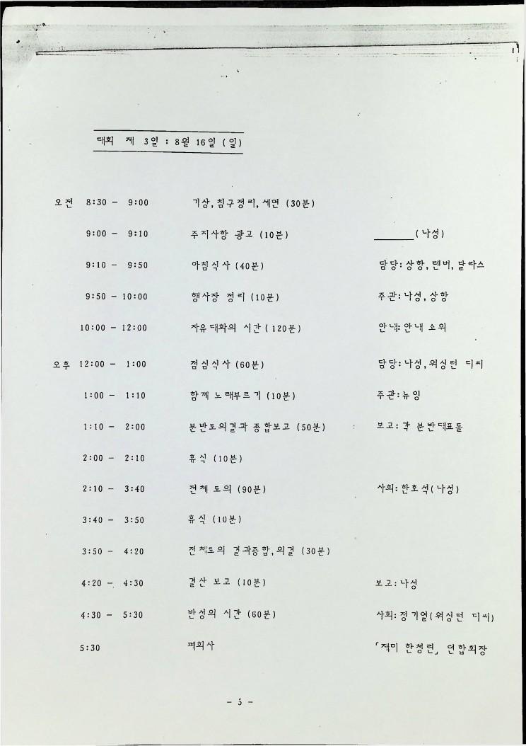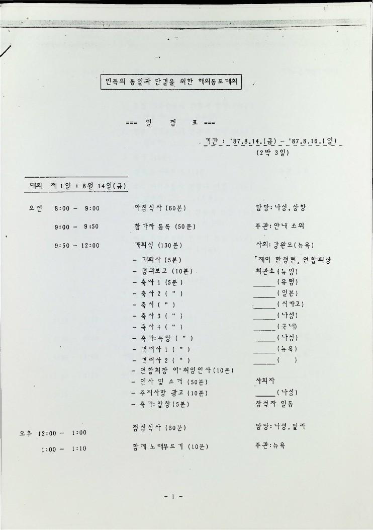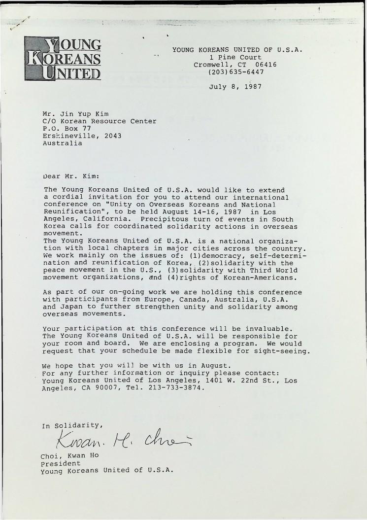 1987년 8월 14일부터 16일까지 로스엔젤레스에서 열리는 민족의 통일과 단결을 위한 해외 동포대회에 한민족연합 (KRC)을 초대하는 초대편지와 일정표이다
