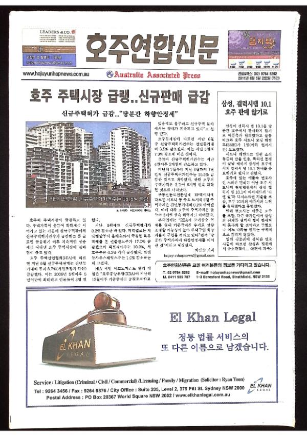 2011년 8월 5일 호주에서 발행된 신문으로 호주 주택시장 급랭..신규판매 급감 / 호주, 대대적 세제개편..10월 공청회 / 북해커 남한 온라인게임 털어 외화벌이 / 권영건 이사장 연임 확정, 청와대 곧 발표 / 당국 통제 속 中지하교회 번성 <WSJ> 등을 싣고 있다