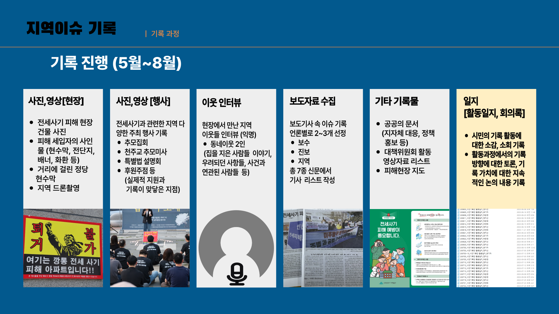 작년부터 미추홀구 곳곳에는 집으로 고통받는 사람들이 많아졌습니다. 이런 상황에서 손동유 (협)아카이브네트워크연구원 원장님께서 지금만 기록할 수 있는 이웃의 아픔을 외면하지 말고, 기록하는 활동으로서 우리의 이웃에 연대해보자는 취지의 제안을 하셨고 이 취지에 동의한 미추홀시민기록단 멤버는 지역 이슈를 기록했습니다.