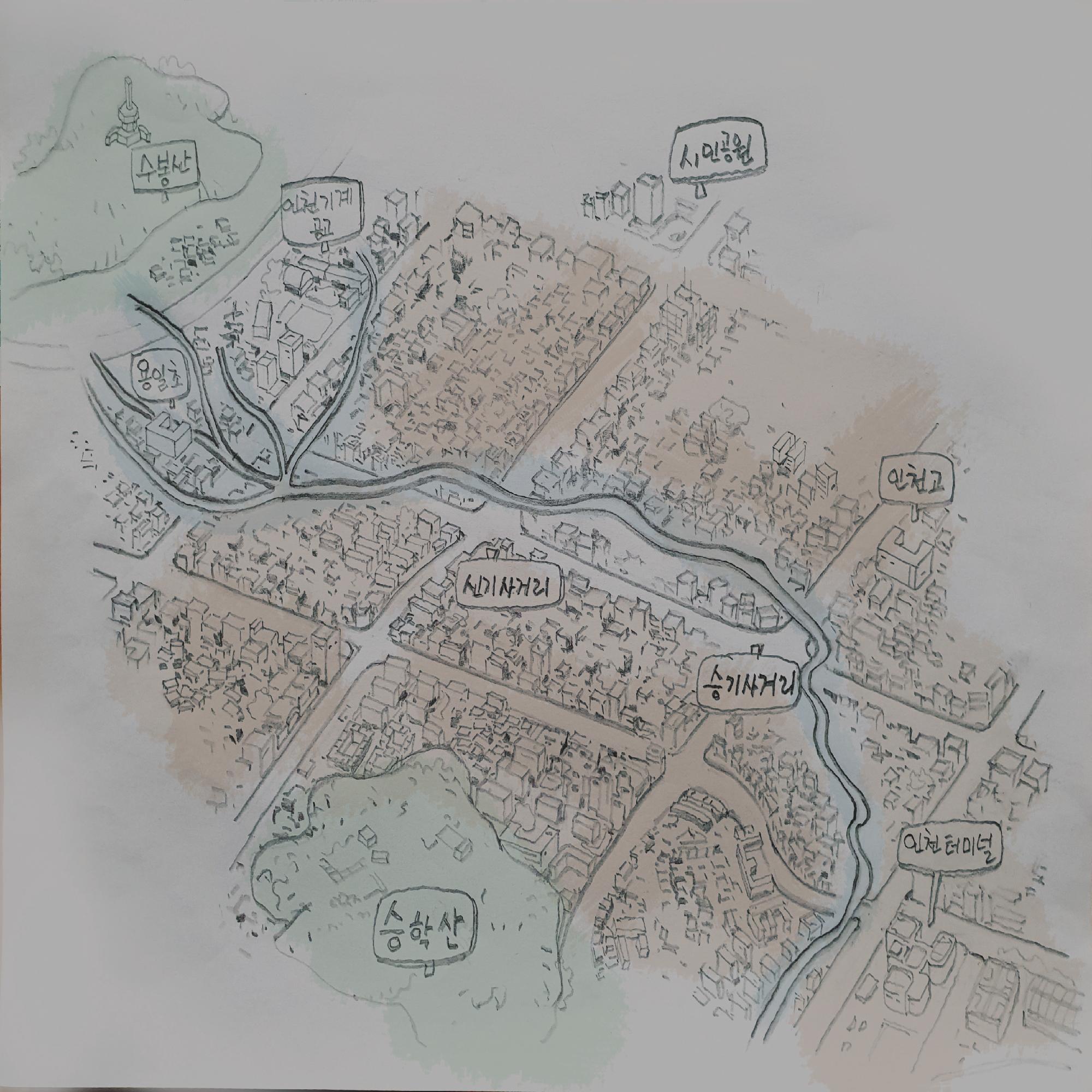 수봉산이 물이 많았던 곳이에요 숭의동 일대 구술자 : 민후남 (61세, 1970년대 숭의동 거주) - 채록일 : 2019년 10월 18일(금) 오후4시, 12월 14일(토) 오후 1시 - 채록자 : 문성예 - 채록 장소 : 숭의평화시장 내 꽃차 마실 “거기가 수봉산이 물이 참 많았어요. 그래서 올라가보면 꼭대기에 이렇게 평평한 돌이. 거기가 물이 많아서 술공장도 그 밑에 있었고요. 와룡소주 공장그리고 그 밑에 미나리밭. 그 옆쪽으로 제물포 방향으로 하고있었으니까 물이 굉장히 많았던 산인데요. 사실 뭐그렇게 펑펑흐르거나 그랬던곳은 아니고 올라가 보면 늘 이렇게 골짜기에 물이 개울 흐르듯이 닿아있었어요.” 자기소개부터 부탁드립니다. 저는요, 우리 미추홀구 토박이라고 말할 수 있는 사람이 7%뿐이 안 된다고 해요. 그 7%에 속하는 사람이고요. 저는 여기 숭의동에서 태어나서 숭의교회 뒤에서 평생 살고, 학교도 다 여기 나오고, 대학만 서울쪽으로 가고 다시 여기 와서 평생을 살고 있는 사람이에요. 그래서 평화시장에 입주한다고 할 때 숭의동이라고 하는 이유 때문에 제가 신청서를 냈어요. 아,그러셨구나? 그럼 여기서 꽃차도 하시고, 어떤 일을 하시는지요? 저는 여기서 청소년 예절 교육부터 시작해서 차 수업하고 여기가 이제 레지던시 작가들이 입주해 있는 공간이에요. 제가 레지던시 대표일을 하고 있어요. 많은 일을 하시네요.v마을을 위해서도. 그러면은 옛날에 승기천이 어땠는지 기억하시는 바를 얘기해주세요 제가 기억하는 승기천은 어렸을 적에 수봉산을 올라가는 길이 사방으로 엄청나게 많아요.독쟁이쪽, 주안쪽, 도화동쪽, 여기 제물포. 올라가는 길이 굉장히 많아요. 저는 숭의교회쪽에 살았으니까 숭의초등학교 옆쪽으로 올라가는 길이 있었는데 어렸을적에 저는 거기가 수봉산이 물이 참 많았어요. 그래서 올라가보면 꼭대기에 이렇게 평평한 돌이. 거기가 물이많아서 술공장도 그 밑에 있었고요, 와룡 소주 공장 그리고 그 밑에 미나리밭.중국 사람들 미나리밭이 있었어요. 그 옆쪽으로 제물포 방향으로 하고 있었으니까 물이 굉장히 많았던 산인데요. 사실 뭐 그렇게 펑펑흐르거나 그랬던곳은 아니고. 올라가보면 늘 이렇게 골짜기에 물이 개울 흐르듯이 닿아있었어요. 그래서 저는 거기 꼭대기에 올라가거나 하면 고인돌같은 돌들이 있었거든요. 거기에 누우면 습하니까, 수봉산이 좀 습해요. 그래서 돌봉숭아라고있어요. 올라가서 조그만 돌을 집어서 물 좀 묻혀가지고 손톱에 문지르면 손톱에 봉숭아 물이 들어요. 누워서 구름보고 막 그러고 잠도 들고. 그러다 껌껌해져서 막 뛰어내려오고 그랬던적도 있고요. 그만큼 그곳이 물이 많이 흘렀어요. 그런데 승기천이라고 하는 것은, 지금 승기 하나만 있는 것이 아니에요. 승기천도 있고 학익천도 있고 그래요. 그런데 승기천을 이야기 하라고하면 승기천이 그 독쟁이(독정이)에서 내려와가지고 인하대, 저쪽에 자유시장 있잖아요. 용일시장? 용일 자유 시장. 그쪽으로 흘러가지고 신기촌으로 가서 저 원인재 그쪽으로 가는 것이 승기천이고요. 그러면 그게 물이 그렇게 많았던 것은 아니고 동네 개울, 웅덩이가 깊었던 곳은 물이 많이 고여 있고 아닌 곳은 요만 뿐(무릎 아래)이 안하게 흘러가면서 그렇게 이어졌어요. 그러다 나중에 그 쪽(신기사거리)에서 모여졌는데 그 곳에서 많이 고였던데는 빨래들도 하고, 고기도 잡고,그런거였죠. 제 기억으로는 학익천이 더 많이 기억이 나죠.저희 집앞이 바로 지금 KT 전화국 있는 그 아래쪽에다가 복개 공사한 곳이거든요. 저희가 숭의교회 뒤쪽에서 태어나서 이제까지 살았는데 복개 공사. 그냥 이렇게 넓은, 여기가 훨씬 넓었죠, 학익천이. 복개 공사를 할 정도면 굉장히 넓을 거예요. 여기도 복개 공사를 한 거예요. 그런데 승기천은 요만씩 했죠. 이렇게 가다가 넓어지고,웅덩이가 깊은곳에는 물이 고이고 그랬던 거고 학익천은 거기서 흘러가지고 어디로 갔었냐면은 저기 토지금고 앞에 전화국 있죠. 거기는 지금도 개울이, 복개 공사를 아직 안한 개울이 크게 흐르는 것이 있어요. 이제 승기천이 이렇게 미추홀구 중심을 지나가는 지역이고 거기(학익천)는 외곽이여서, 승기천이 이야기가 되는 것 같은데요. 저는 승기천 쪽은 비 많이 올 때 고기를 잡았던 기억, 그리고 수봉공원에 올라가서 누워서 돌봉숭아하던 기억. 물이 늘있었어요, 물이. 물이 많이 펑펑 나오는 것은 아니고 그냥 젖어 있는 정도 있잖아요. 그게 여러 갈래가 있으니까 모여서 이렇게 내려가게 돼요, 밑에는(인주대로). 수봉산이 물이 많았던 곳이에요. 그, 수봉산이 이렇게 있다면 일(이 리)로 이렇게 승기천이 내려가고, 이리로는 학익천이 내려가면. 이쪽으로 제물포 앞 역으로는 미나리 밭이 쭉, 미나리 밭이 원래 물에서 자라잖아요. 그리고 와룡소주 공장, 술 공장. 그런게 있어 다 물로 이루어져 있었어요, 주위가. 미추홀구에 물이 진짜 많았네요. 그런데 이야기를 듣다보니까 궁금해지는 것이 있는데, 나이가 어떻게 되세요? 저요? 올해 환갑이에요. 그때가, 지금 말씀하시는 그 때는 몇 년도라고 생각하면 될까요? 선생님 몇 살때? 그때는 제가 산에 