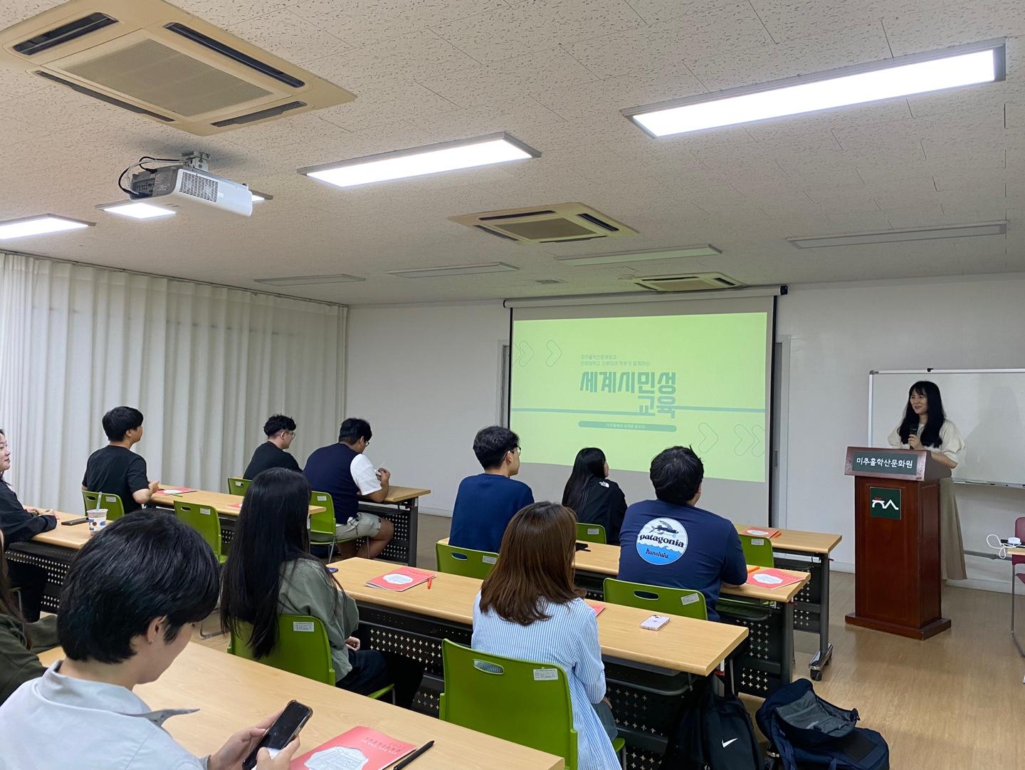 미추홀학산문화원이 인하대학교 프런티어 학부과 협약을 통해 2023년 2학기 '세계시민성교육'강좌의 일부 과정을 공동기획, 운영하였다. 사진은 1차시인 '동양평화와 전환 사회의 인천'의 현장사진이다. 강의는 김현석 인천민속학회 이사가 맡았으며, 지역적 관점에서 시작하여 세계 시민성까지 확장하는 시선을 담은 강의가 진행되었다.