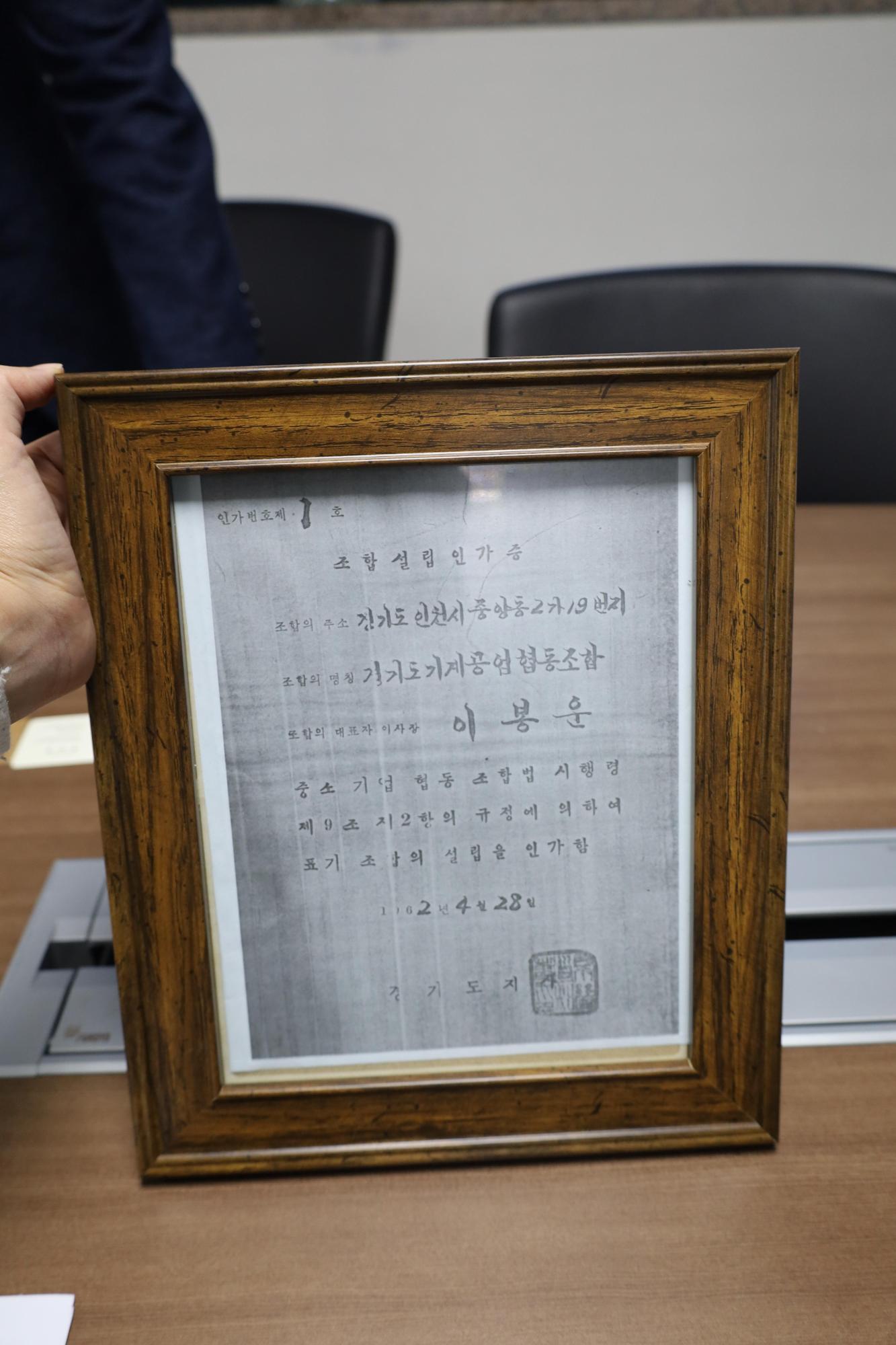 결기도기계공업협동조합(당시 명칭) 설립인가증 사본 사진이다.