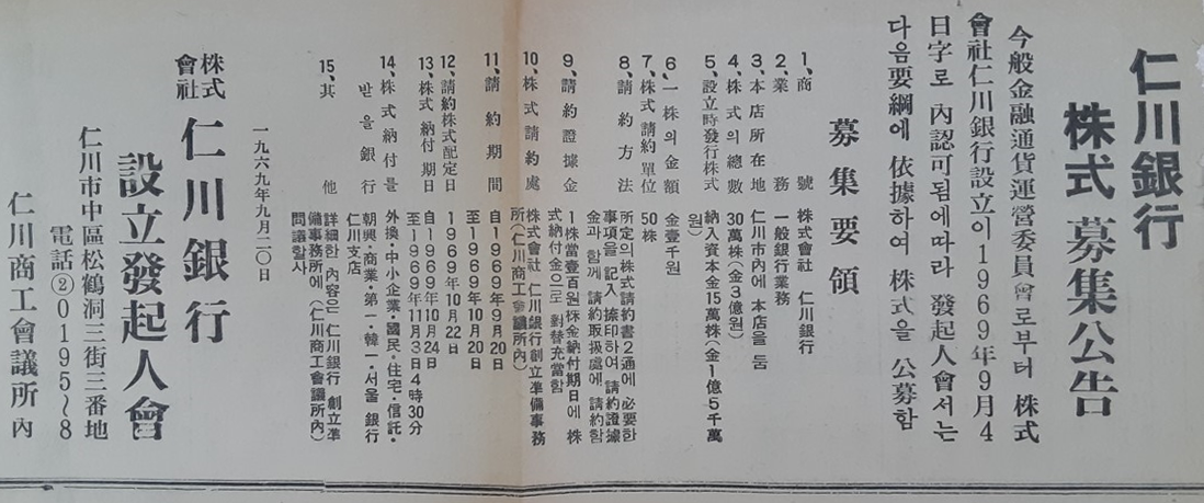 1969년 9월 20일에 실린 인천은행 주식 공고 광고 신문 사진이다.