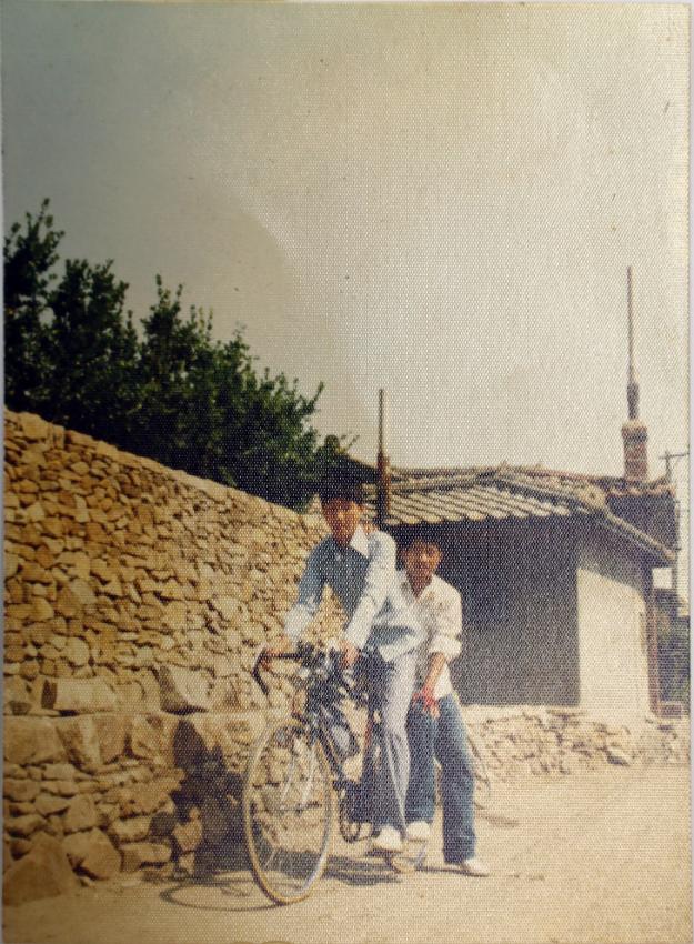 호미마을 인근 주택 돌담에서 친구와 함께 자전거를 함께 타고 있음.