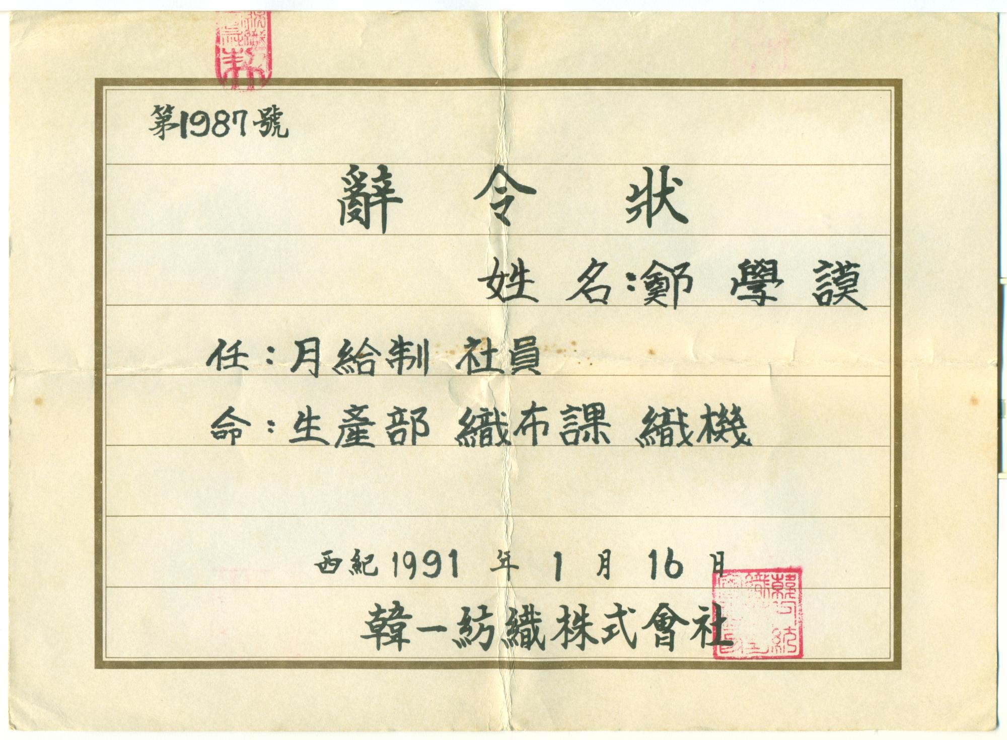 직포과 공원에서 직포과 사원으로 진급받은 사령장