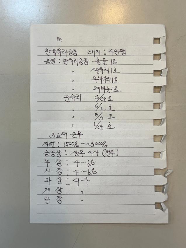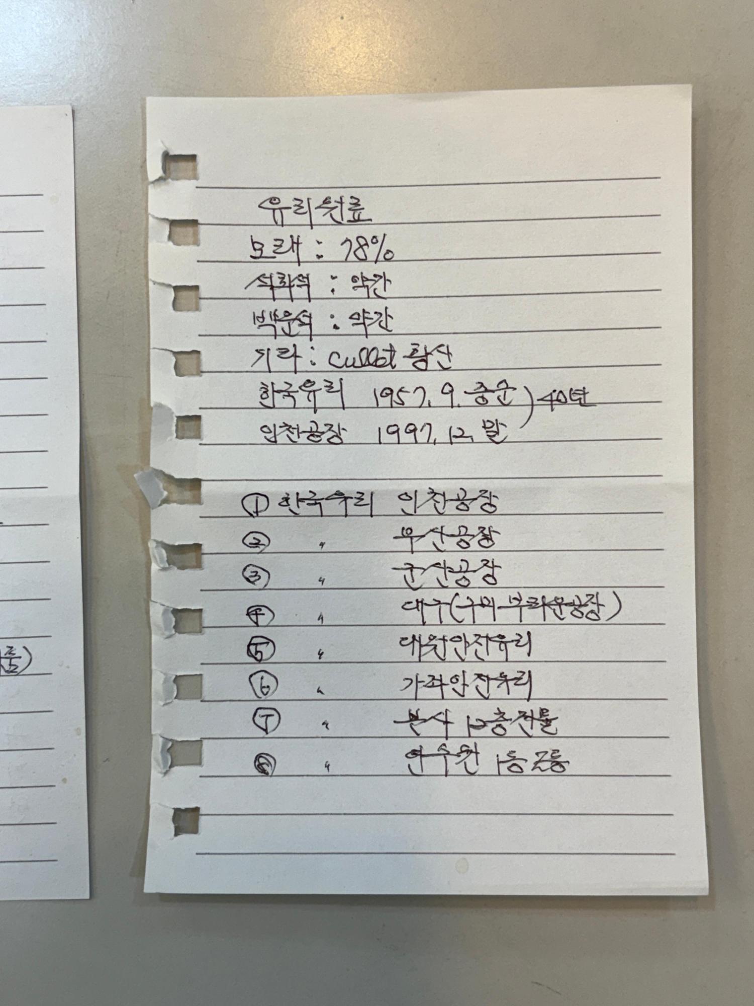 지무환(전 한국유리 근로자)의 1차 인터뷰 중 구술자가 준비한 메모를 찍은 사진이다.
