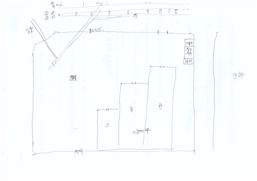 지무환(전 한국유리 근로자)의 2차 인터뷰 중 구술자가 메모한 한국유리 창고의 위치, 배치 등을 설명한 문서이다.