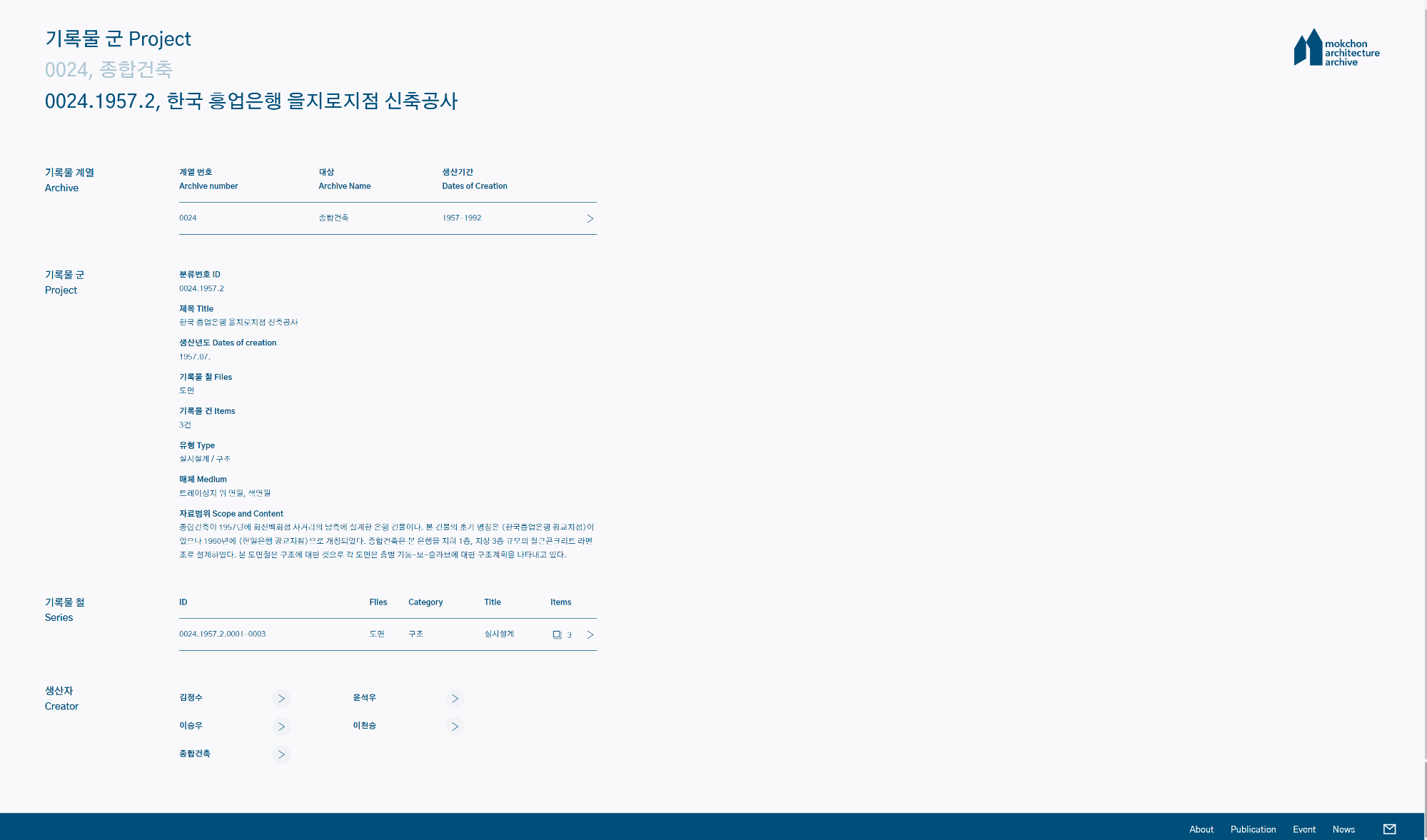 목천건축아카이브는 재단법인 목천문화재단이 진행하는 주요 건축문화기반사업의 일환으로 설립되었습니다. 비영리법인과 건축가, 건축학자들의 자발적인 모임으로, 한국의 근·현대 건축기록물을 수집·보존·활용하는 역할을 한다고 합니다. 2010년부터 건축가의 구술채록사업과 건축가, 건축물 단위의 기록물 수집 활동을 진행하고 있으며 이를 토대로 연구, 출간, 세미나, 비평 활동을 진행하고 있습니다. 목천건축아카이브 운영위원회는 배형민(서울시립대학교), 전봉희(서울대학교), 우동선(한국예술종합학교), 최원준(숭실대학교) 으로 구성되어있습니다.
