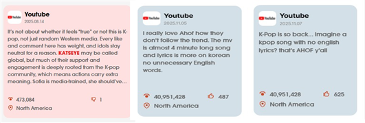 [그림 1] AI 기반 한류 빅데이터 대시보드 ‘원문 분석’ 내 캣츠아이(좌)와 아홉(우)을 통한 케이팝 정체성에 대한 논의(출처: 한국국제문화교류진흥원)