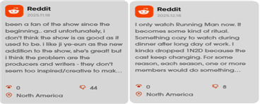 2025년에도 《SBS》의 장수 예능 <런닝맨>은 버라이어티 부문 상위 키워드를 유지하며 글로벌 인지도를 이어간 것으로 나타났다. 다만 프로그램 포맷 변화에 대한 아쉬움과 반복성에서 비롯된 피로감이 함께 제기됐다. 9월 1일 기준 ‘원문 분석’ 결과, 해외 시청자들은 <런닝맨> 초창기의 신체적 도전과 즉각적인 유머를 프로그램의 핵심 정체성으로 기억하고 있으며, 최근 회차에서는 이러한 요소가 약화됐다고 평가했다. 이 같은 인식은 데이터에서도 확인됐다. 2025년 8~9월 ‘트렌드 감성 분석’에 따르면, <런닝맨>의 언급량은 상위 키워드 내에서 점진적인 감소 추세를 보였다. 그럼에도 글로벌 시청자들은 시청을 중단하기보다는, 변화의 방향을 두고 지속적으로 의견을 나누며 비판과 애착이 공존하는 방식으로 콘텐츠를 소비하는 모습을 보였다. 이는 장기 콘텐츠가 온라인 담론 속에서 재해석·재구성되며 생명력을 유지하는 방식을 보여준다.